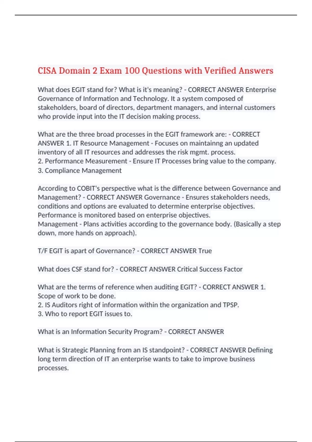 CISA Domain 2 Exam 100 Questions with Verified Answers What does EGIT stand for? What is it's meaning? - CORRECT ANSWER Enterprise Governance of Information and Technology. It a system composed of stakeholders, board of directors, department managers, and internal customers who provide input into the IT decision making process. What are the three broad processes in the EGIT framework are: - CORRECT ANSWER 1. IT Resource Management - Focuses on maintainng an updated inventory of all IT resources and addresses the risk mgmt. process. 2. Performance Measurement - Ensure IT Processes bring value to the company. 3. Compliance Management According to COBIT's perspective what is the difference between Governance and Management? - CORRECT ANSWER Governance - Ensures stakeholders needs, conditions and options are evaluated to determine enterprise objectives. Performance is monitored based on enterprise objectives. Management - Plans activities according to the governance body. (Basically a step down, more hands on approach). T/F EGIT is apart of Governance? - CORRECT ANSWER True What does CSF stand for? - CORRECT ANSWER Critical Success Factor What are the terms of reference when auditing EGIT? - CORRECT ANSWER 1. Scope of work to be done. 2. IS Auditors right of information within the organization and TPSP. 3. Who to report EGIT issues to. What is an Information Security Program? - CORRECT ANSWER What is Strategic Planning from an IS standpoint? - CORRECT ANSWER Defining long term direction of IT an enterprise wants to take to improve business processes. T/F: Strategic IS Planning involves considering, cost, benefit, and risk of implementing new technology. - CORRECT ANSWER True What are some common uses of Business Intelligence? - CORRECT ANSWER A) Legal Requirements, for businesses to understand what's occurring in there own business. B) Competitive advantage for Supply chain and other areas C) The increasing size and complexity of organizations. What are the two components which allow BI to operate effectively? - CORRECT ANSWER A) The enterprise data flow architecture B) A logical data architecture What are the layers/components of EDFA? - CORRECT ANSWER Enterprise Data Flow Architecture is composed of the following layers: 1. Presentation/desktop access layer - 2. Data source layer - 3. Core data warehouse 4. Data mart layer 5. Data staging and quality layer 6. Data access layer 7. Data preparation layer 8. Metadata repository layer 9. Warehouse management layer 10. Application messaging layer 11. Internet/intranet layer What is the Presentation/desktop access layer? - CORRECT ANSWER Where end users deal with data, this includes spreadsheets, dashboards, and querying tools What is the Data Source Layer? - CORRECT ANSWER Enterprise infomration derived from sources like operational data, external data, and nonoperational data. What is a data warehouse? - CORRECT ANSWER Where the majority of data of interest is captured for analysis. Typically a large relational database. What is a data mart layer? - CORRECT ANSWER A subset of information in the DW that relates to a particular business system. What is the data staging and quality layer? - CORRECT ANSWER Layer responsible for data copying into the DW. Ensuring data is formatted properly before loaded into the DW. Needs to be flexible in case data changes like format of customer accounts for example. What is the data access layer? - CORRECT ANSWER Between the data source layer and the data staging layer. What is the data preparation layer? - CORRECT ANSWER Prepares data to be loaded into data marts. What is the metadata repository layer? - CORRECT ANSWER Metadata are data about data. This includes the purpose of systems of business that data moving through the architecture is involved in. What is the Warehouse management layer? - CORRECT ANSWER This layer is concerned with scheduling the transfer of data into the DW and Data marts. Also involved in security. What is the application messaging layer? - CORRECT ANSWER Layer concerned with transporting information between the various layers. Including business data, this layer encompasses storage and targeted communication of control messages. What is the internet/intranet layer? - CORRECT ANSWER Basic Data Communications like browser based user interfaces and TCP/IP protocol networking What is a context diagram? - CORRECT ANSWER A chart which outlines processes of an organization and external parties with which the organization interacts with. What is an activity or swim-lane diagram? - CORRECT ANSWER Give concise overview of business processes. What is an entity relationship diagram? - CORRECT ANSWER Diagram which depicts data entities and how they relate. What is the purpose of implementing a business/IT advisory team in the area of BI funding governance? - CORRECT ANSWER To best ensure ROI and that areas are prioritized by need. Give some examples of EGIT frameworks. - CORRECT ANSWER 1. COBIT 2. International Organization of Standardization(ISO)/IEC 3. Information Technology Infrastructure Library (ITIL) 4. Open Information Security Management Maturity Model (O-ISM3) 5. ISO/IEC Information Technology - Governance of IT for the Organization 6. ISO/IEC 20000 7. ISO 3100:2018 Risk management- Guidelines What is a data classification policy? - CORRECT ANSWER Describes classifications, levels of controls at each classification and authorization rules for data. What is an end-user computing policy? - CORRECT ANSWER Describes the usage of desktop, mobile computing and other tools by users. T/F: A record of managements review for ISP's should be maintained. - CORRECT ANSWER True Which group is more involved in implementation of IT Systems, the IT Steering Committee or IT Strategy Committee? - CORRECT ANSWER IT Steering Committee What kind of personnel make up the IT Strategy Committee? - CORRECT ANSWER Board members and specialists What personnel are apart of the IT Steering Committee? - CORRECT ANSWER E