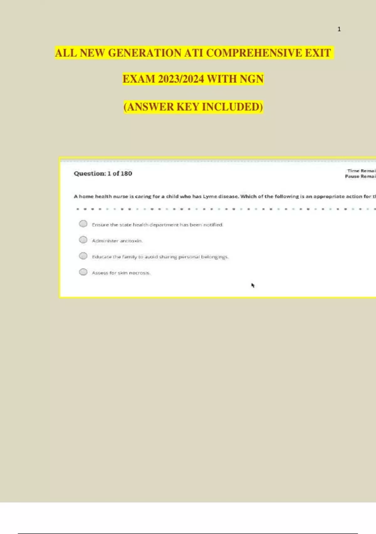This document features the ATI Comprehensive Exit Exam 2024 (Next Generation NCLEX format) complete with a verified answer key. It includes updated NGN-style questions that assess clinical judgment, prioritization, pharmacology, medical-surgical nursing, maternal–newborn care, pediatrics, and mental health concepts. Designed for nursing students preparing for ATI final assessments or NCLEX-RN readiness, this resource provides comprehensive, exam-style review and evidence-based solutions. ALL NEW GENERATION ATI COMPREHENSIVE EXIT EXAM 2023/2024 WITH NGN (ANSWER KEY INCLUDED) ALL NEW GENERATION ATI COMPREHENSIVE EXIT EXAM 2023/2024 WITH NGN (ANSWER KEY INCLUDED) ALL NEW GENERATION ATI COMPREHENSIVE EXIT EXAM 2023/2024 WITH NGN (ANSWER KEY INCLUDED)