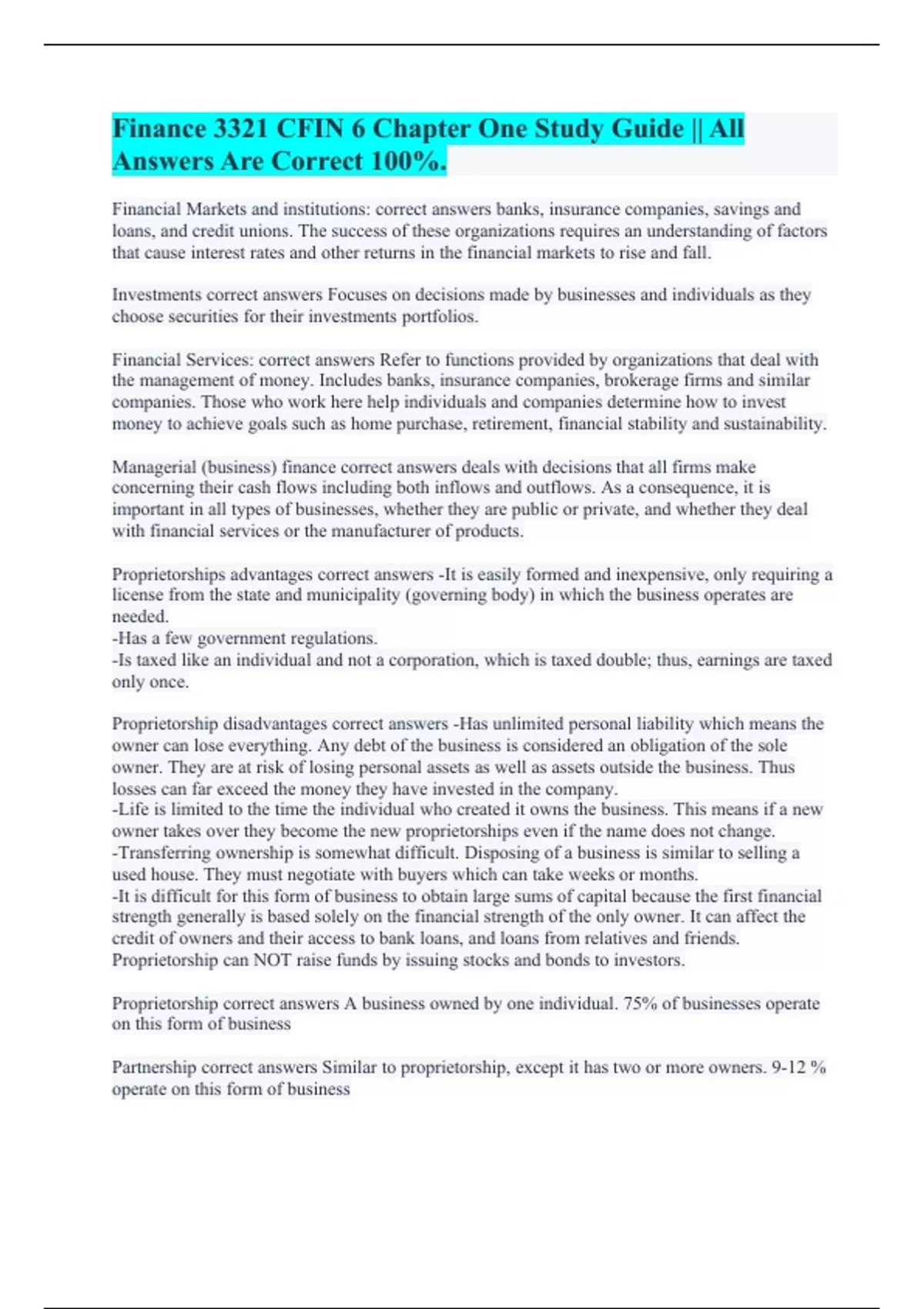 Financial Markets and institutions: correct answers banks, insurance companies, savings and loans, and credit unions. The success of these organizations requires an understanding of factors that cause interest rates and other returns in the financial markets to rise and fall. Investments correct answers Focuses on decisions made by businesses and individuals as they choose securities for their investments portfolios. Financial Services: correct answers Refer to functions provided by organizations that deal with the management of money. Includes banks, insurance companies, brokerage firms and similar companies. Those who work here help individuals and companies determine how to invest money to achieve goals such as home purchase, retirement, financial stability and sustainability. Managerial (business) finance correct answers deals with decisions that all firms make concerning their cash flows including both inflows and outflows. As a consequence, it is important in all types of businesses, whether they are public or private, and whether they deal with financial services or the manufacturer of products. Proprietorships advantages correct answers -It is easily formed and inexpensive, only requiring a license from the state and municipality (governing body) in which the business operates are needed. -Has a few government regulations. -Is taxed like an individual and not a corporation, which is taxed double; thus, earnings are taxed only once. Proprietorship disadvantages correct answers -Has unlimited personal liability which means the owner can lose everything. Any debt of the business is considered an obligation of the sole owner. They are at risk of losing personal assets as well as assets outside the business. Thus losses can far exceed the money they have invested in the company. -Life is limited to the time the individual who created it owns the business. This means if a new owner takes over they become the new proprietorships even if the name does not change. -Transferring ownership is somewhat difficult. Disposing of a business is similar to selling a used house. They must negotiate with buyers which can take weeks or months. -It is difficult for this form of business to obtain large sums of capital because the first financial strength generally is based solely on the financial strength of the only owner. It can affect the credit of owners and their access to bank loans, and loans from relatives and friends. Proprietorship can NOT raise funds by issuing stocks and bonds to investors. Proprietorship correct answers A business owned by one individual. 75% of businesses operate on this form of business Partnership correct answers Similar to proprietorship, except it has two or more owners. 9-12 % operate on this form of business