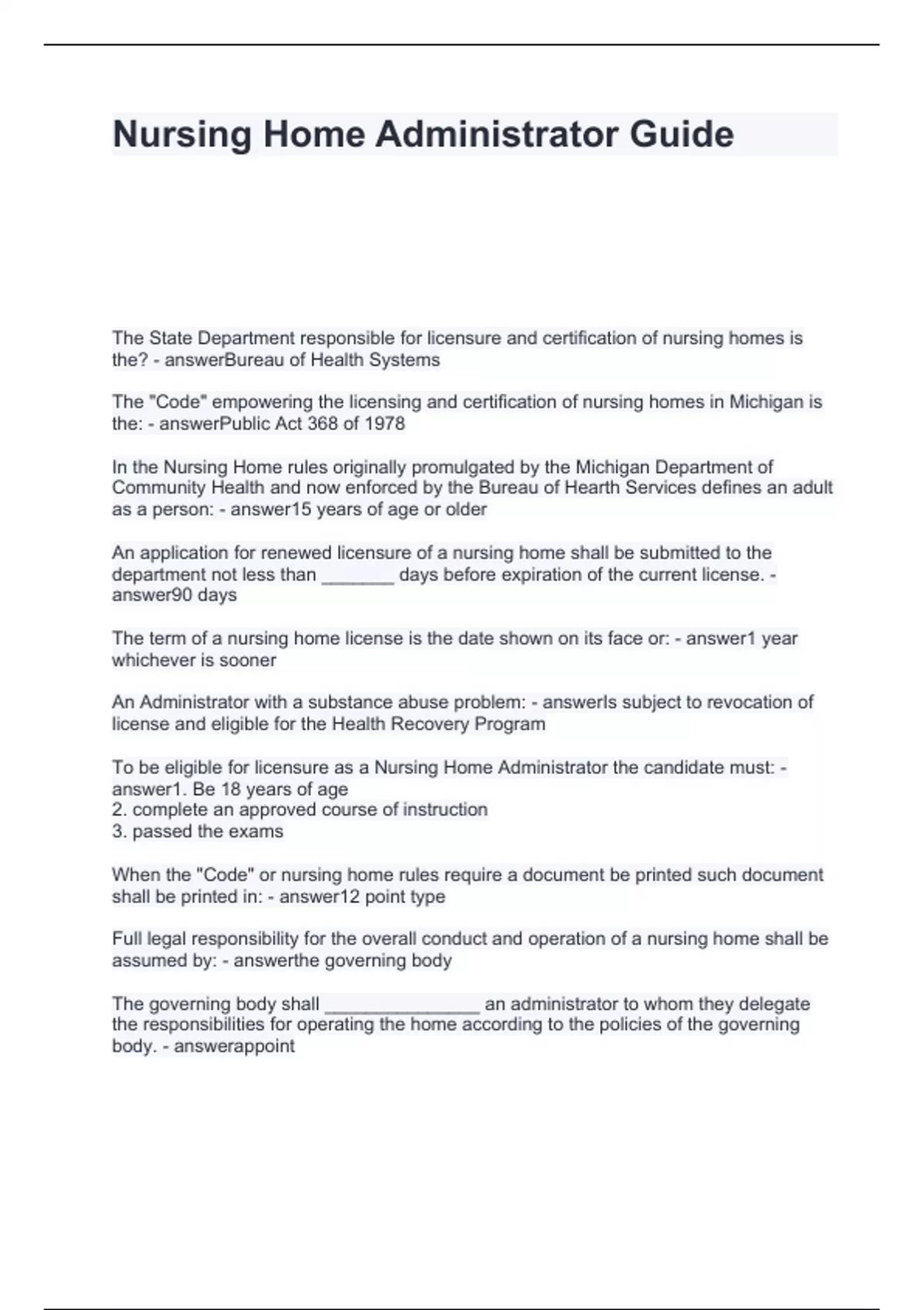 Nursing Home Administrator Guide Questions and Answers 2024