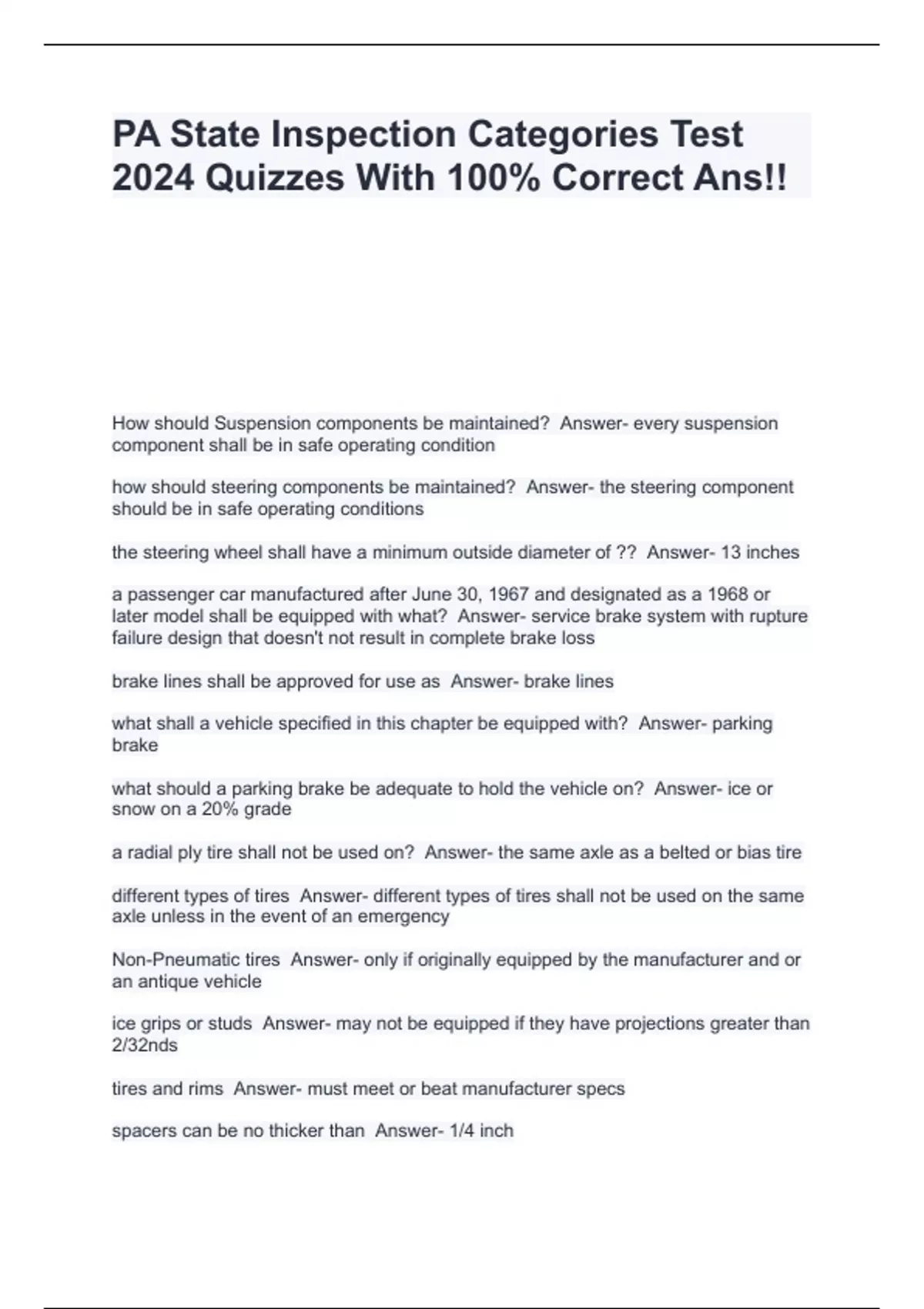 PA State Inspection Categories Test 2024 Quizzes With 100% Correct Ans!! How should Suspension components be maintained? how should steering components be maintained? the steering wheel shall have a minimum outside diameter of ?? a passenger car manufactured after June 30, 1967 and designated as a 1968 or later model shall be equipped with what? brake lines shall be approved for use as what shall a vehicle specified in this chapter be equipped with? what should a parking brake be adequate to hold the vehicle on? a radial ply tire shall not be used on? different types of tires Non-Pneumatic tires ice grips or studs tires and rims spacers can be no thicker than what head lamp system should your vehicle be equipped with low beam candle watts must be brighter than? high beam candle watts cannot be less than? total candle wattage cannot exceed? lamps must be visible from how far?