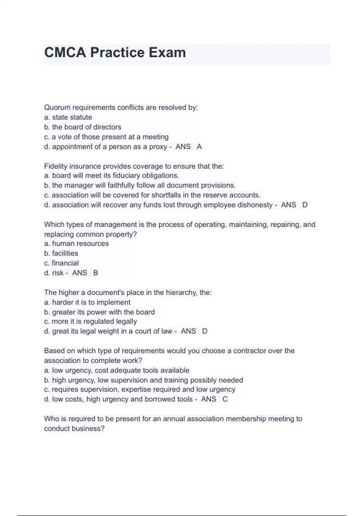 CMCA Practice Exam Questions And Answers Quorum requirements conflicts are resolved by: a. state statute b. the board of directors c. a vote of those present at a meeting d. appointment of a person as a proxy - ANS A Fidelity insurance provides coverage to ensure that the: a. board will meet its fiduciary obligations. b. the manager will faithfully follow all document provisions. c. association will be covered for shortfalls in the reserve accounts. d. association will recover any funds lost through employee dishonesty - ANS D Which types of management is the process of operating, maintaining, repairing, and replacing common property? a. human resources b. facilities c. financial d. risk - ANS B The higher a document's place in the hierarchy, the: a. harder it is to implement b. greater its power with the board c. more it is regulated legally d. great its legal weight in a court of law - ANS D Based on which type of requirements would you choose a contractor over the association to complete work? a. low urgency, cost adequate tools available b. high urgency, low supervision and training possibly needed c. requires supervision, expertise required and low urgency d. low costs, high urgency and borrowed tools - ANS C Who is required to be present for an annual association membership meeting to conduct business?