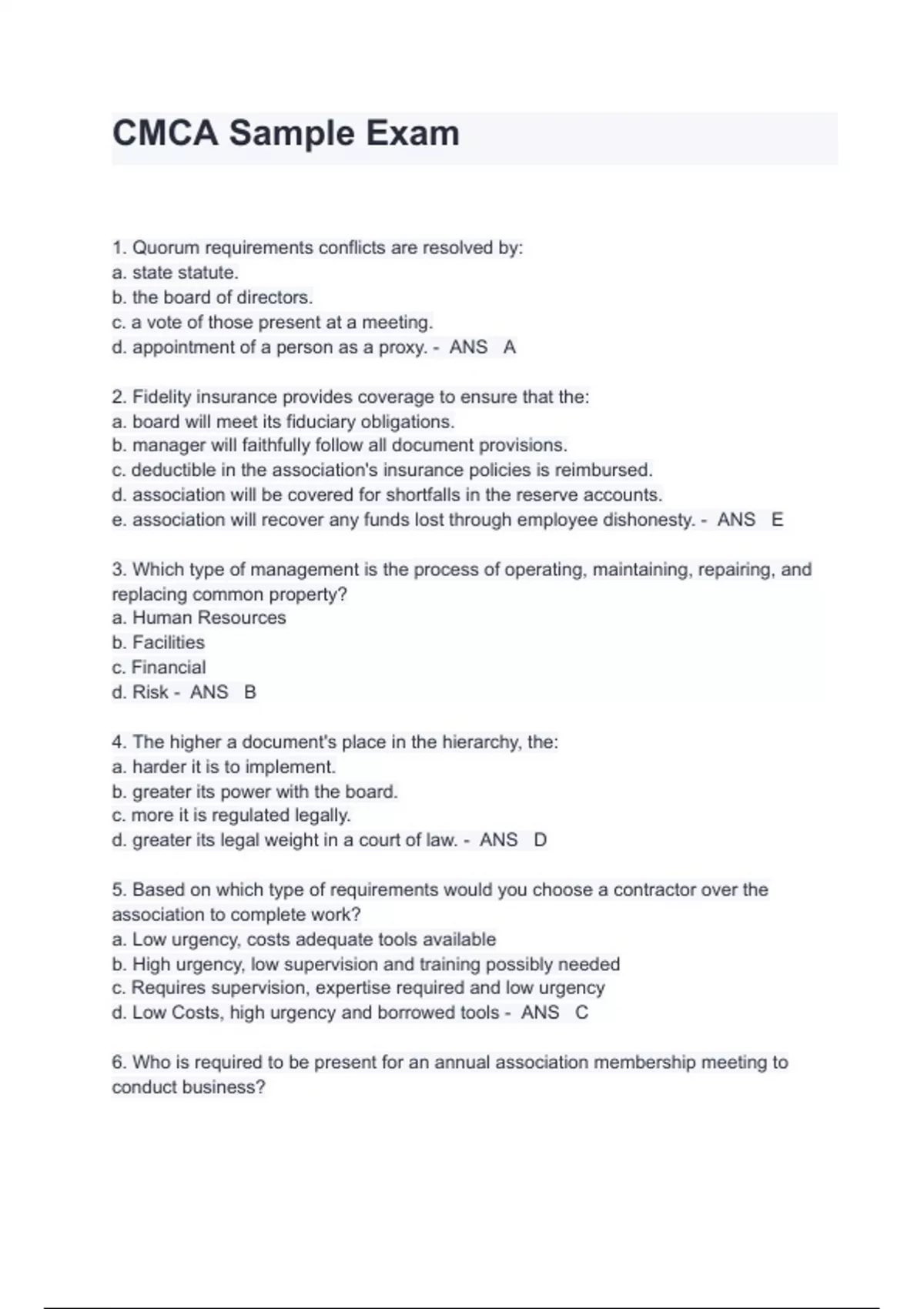 CMCA Sample Exam Questions And Answers 1. Quorum requirements conflicts are resolved by: a. state statute. b. the board of directors. c. a vote of those present at a meeting. d. appointment of a person as a proxy. - ANS A 2. Fidelity insurance provides coverage to ensure that the: a. board will meet its fiduciary obligations. b. manager will faithfully follow all document provisions. c. deductible in the association's insurance policies is reimbursed. d. association will be covered for shortfalls in the reserve accounts. e. association will recover any funds lost through employee dishonesty. - ANS E 3. Which type of management is the process of operating, maintaining, repairing, and replacing common property? a. Human Resources b. Facilities c. Financial d. Risk - ANS B 4. The higher a document's place in the hierarchy, the: a. harder it is to implement. b. greater its power with the board. c. more it is regulated legally. d. greater its legal weight in a court of law. - ANS D 5. Based on which type of requirements would you choose a contractor over the association to complete work? a. Low urgency, costs adequate tools available b. High urgency, low supervision and training possibly needed c. Requires supervision, expertise required and low urgency d. Low Costs, high urgency and borrowed tools - ANS C 6. Who is required to be present for an annual association membership meeting to conduct business?