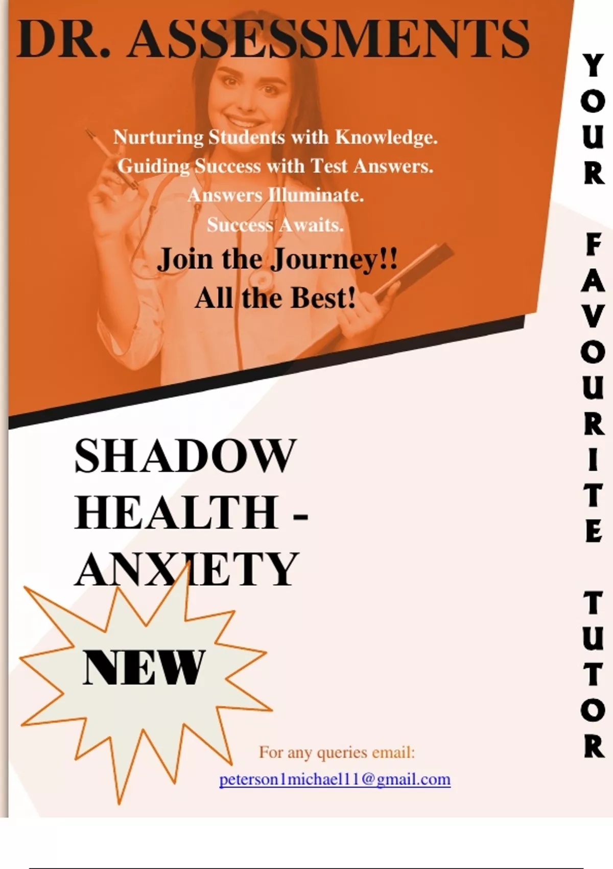 SHADOW HEALTH - ANXIETY Correctly Answered Questions, Questions and Answers with Explanations (latest Update), 100% Correct, Download to Score A