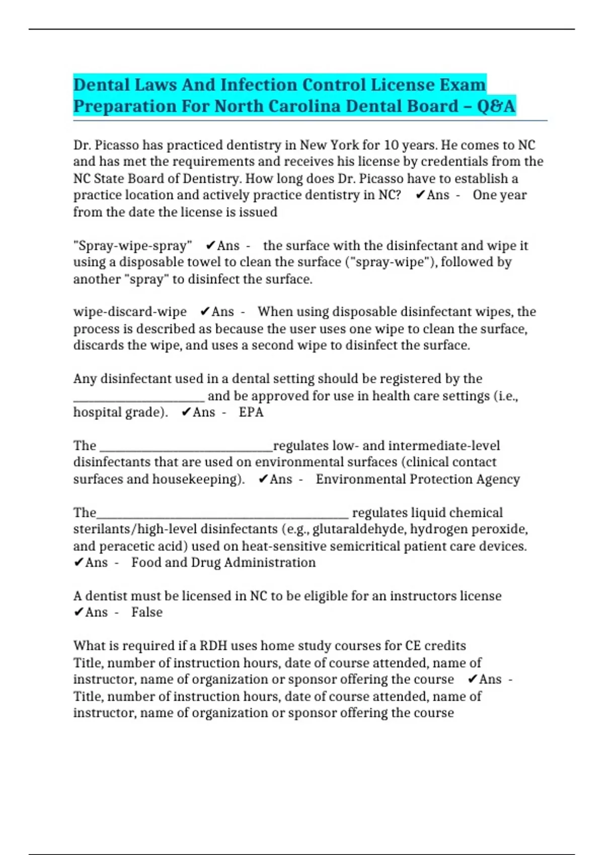 Dental Laws And Infection Control License Exam Preparation For North Carolina Dental Board – Q&A