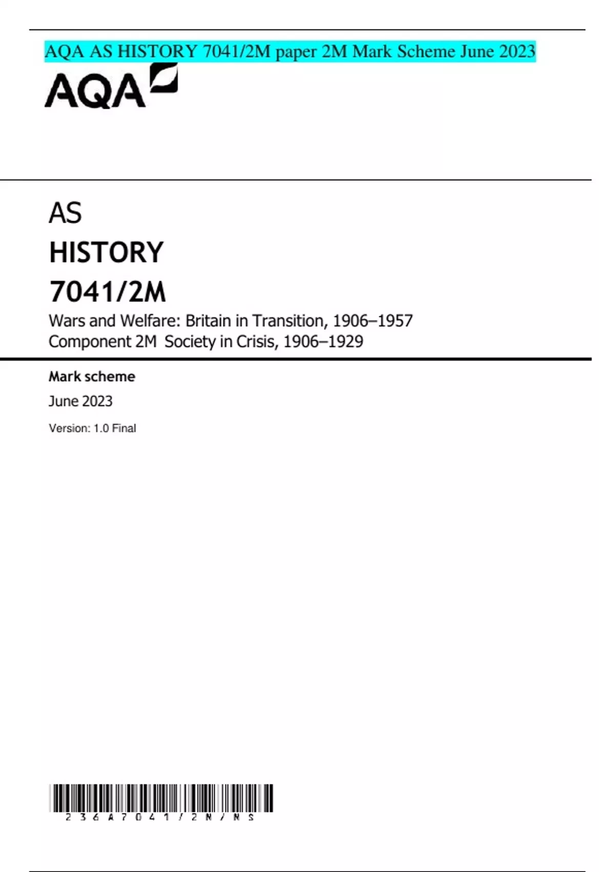 AQA AS HISTORY 7041/2M paper 2M Mark Scheme June 2023