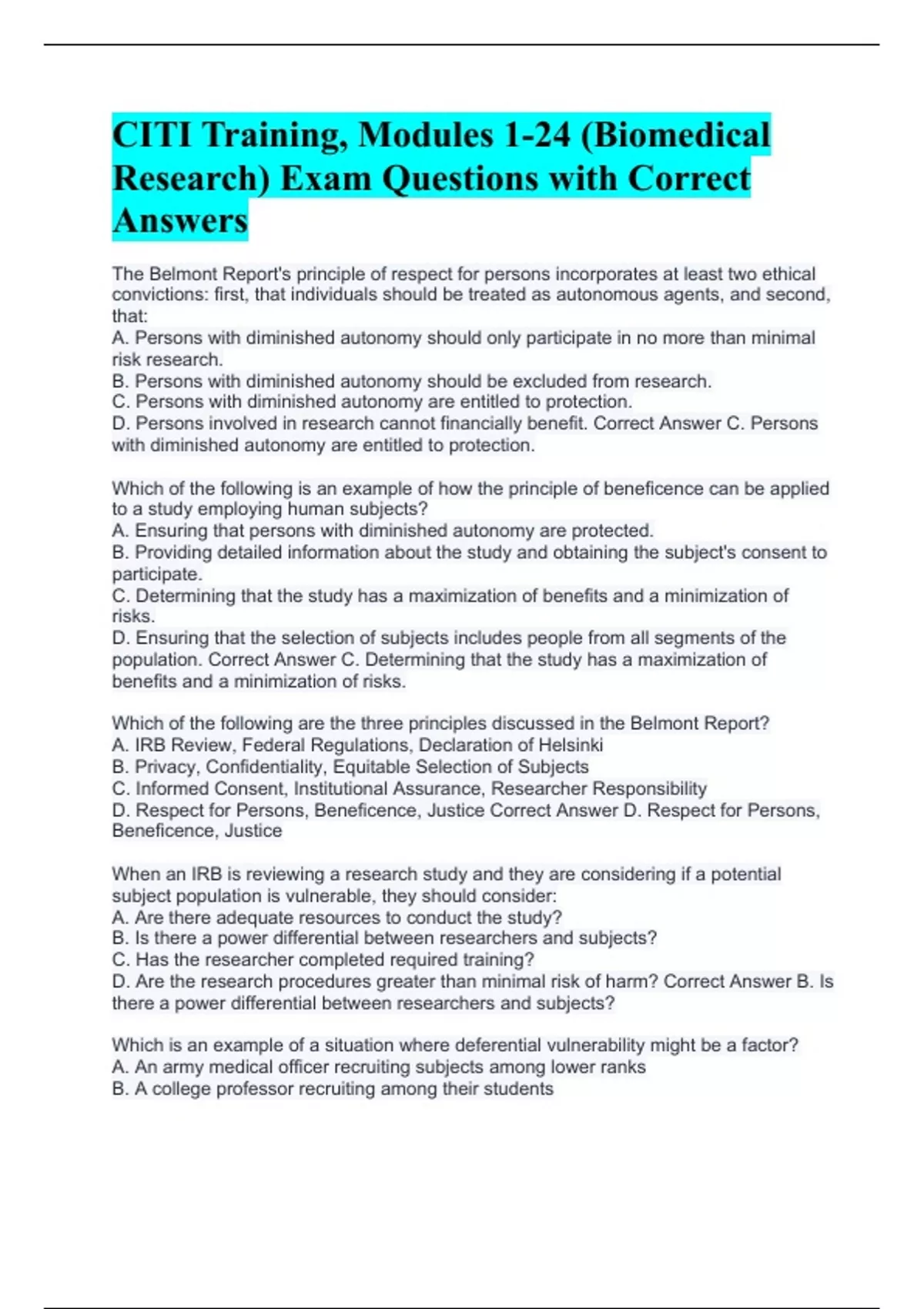 The Belmont Report's principle of respect for persons incorporates at least two ethical convictions: first, that individuals should be treated as autonomous agents, and second, that: A. Persons with diminished autonomy should only participate in no more than minimal risk research. B. Persons with diminished autonomy should be excluded from research. C. Persons with diminished autonomy are entitled to protection. D. Persons involved in research cannot financially benefit. Correct Answer C. Persons with diminished autonomy are entitled to protection. Which of the following is an example of how the principle of beneficence can be applied to a study employing human subjects? A. Ensuring that persons with diminished autonomy are protected. B. Providing detailed information about the study and obtaining the subject's consent to participate. C. Determining that the study has a maximization of benefits and a minimization of risks. D. Ensuring that the selection of subjects includes people from all segments of the population. Correct Answer C. Determining that the study has a maximization of benefits and a minimization of risks. Which of the following are the three principles discussed in the Belmont Report? A. IRB Review, Federal Regulations, Declaration of Helsinki B. Privacy, Confidentiality, Equitable Selection of Subjects C. Informed Consent, Institutional Assurance, Researcher Responsibility D. Respect for Persons, Beneficence, Justice Correct Answer D. Respect for Persons, Beneficence, Justice When an IRB is reviewing a research study and they are considering if a potential subject population is vulnerable, they should consider: A. Are there adequate resources to conduct the study? B. Is there a power differential between researchers and subjects? C. Has the researcher completed required training? D. Are the research procedures greater than minimal risk of harm? Correct Answer B. Is there a power differential between researchers and subjects? Which is an example of a situation where deferential vulnerability might be a factor? A. An army medical officer recruiting subjects among lower ranks B. A college professor recruiting among their students