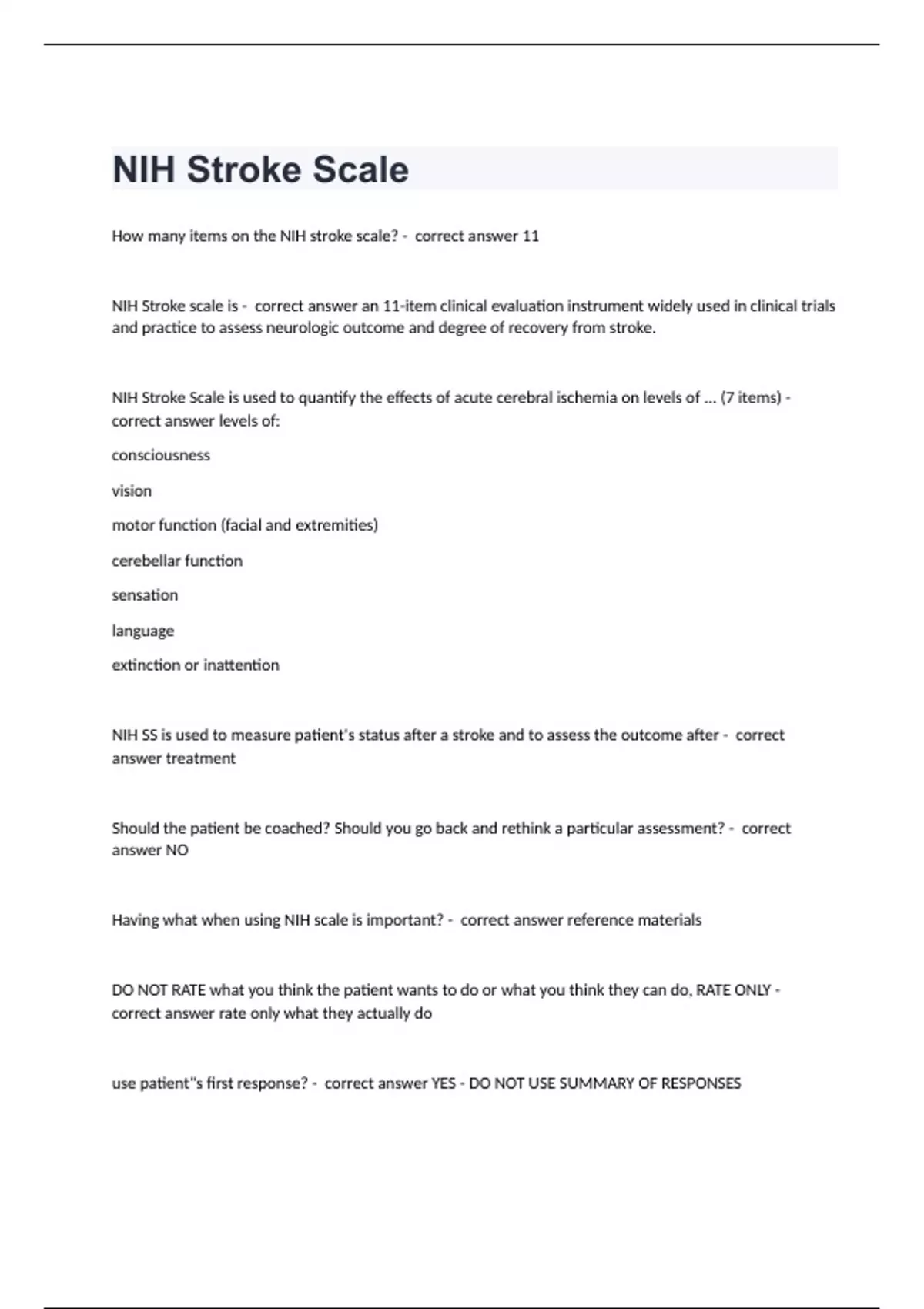 NIH Stroke ScaleHow many items on the NIH stroke scale? - correct answer 11 NIH Stroke scale is - correct answer an 11-item clinical evaluation instrument widely used in clinical trials and practice to assess neurologic outcome and degree of recovery from stroke. NIH Stroke Scale is used to quantify the effects of acute cerebral ischemia on levels of ... (7 items) - correct answer levels of: consciousness vision motor function (facial and extremities) cerebellar function sensation language extinction or inattention NIH SS is used to measure patient's status after a stroke and to assess the outcome after - correct answer treatment Should the patient be coached? Should you go back and rethink a particular assessment? - correct answer NO Having what when using NIH scale is important? - correct answer reference materials DO NOT RATE what you think the patient wants to do or what you think they can do, RATE ONLY - correct answer rate only what they actually do use patient"s first response? - correct answer YES - DO NOT USE SUMMARY OF RESPONSES