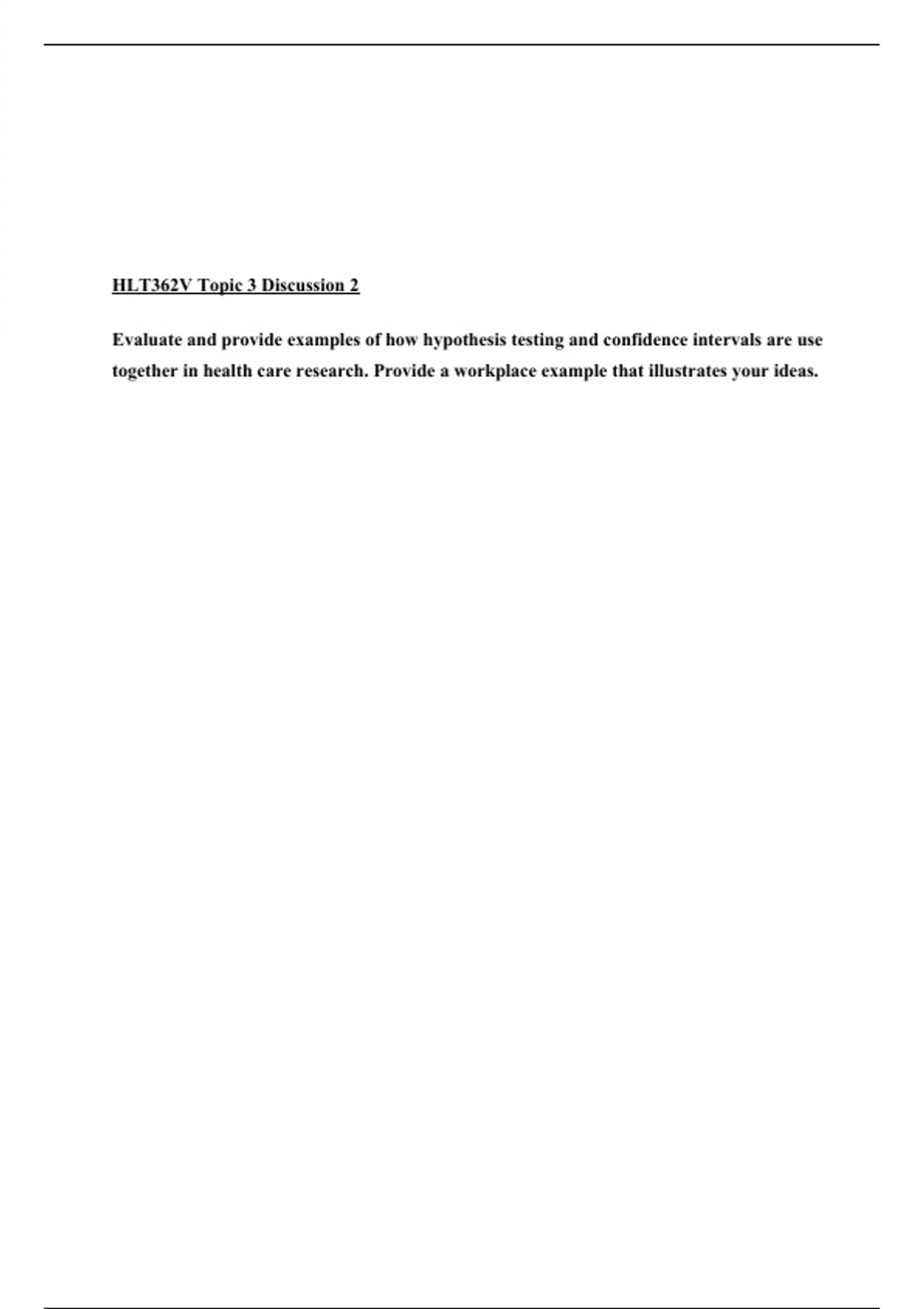 HLT362V Topic 3 Discussion 2 Evaluate and provide examples of how hypothesis testing and confidence intervals are use together in health care research. Provide a workplace example that illustrates your ideas.