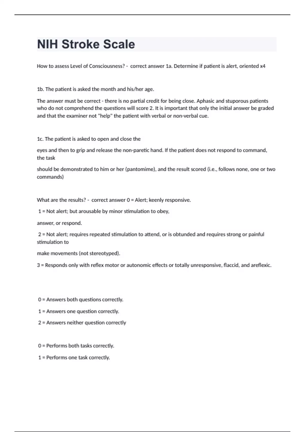 NIH Stroke ScaleHow to assess Level of Consciousness? - correct answer 1a. Determine if patient is alert, oriented x4 1b. The patient is asked the month and his/her age. The answer must be correct - there is no partial credit for being close. Aphasic and stuporous patients who do not comprehend the questions will score 2. It is important that only the initial answer be graded and that the examiner not "help" the patient with verbal or non-verbal cue. 1c. The patient is asked to open and close the eyes and then to grip and release the non-paretic hand. If the patient does not respond to command, the task should be demonstrated to him or her (pantomime), and the result scored (i.e., follows none, one or two commands) What are the results? - correct answer 0 = Alert; keenly responsive. 1 = Not alert; but arousable by minor stimulation to obey, answer, or respond. 2 = Not alert; requires repeated stimulation to attend, or is obtunded and requires strong or painful stimulation to make movements (not stereotyped). 3 = Responds only with reflex motor or autonomic effects or totally unresponsive, flaccid, and areflexic. 0 = Answers both questions correctly. 1 = Answers one question correctly. 2 = Answers neither question correctly 0 = Performs both tasks correctly.
