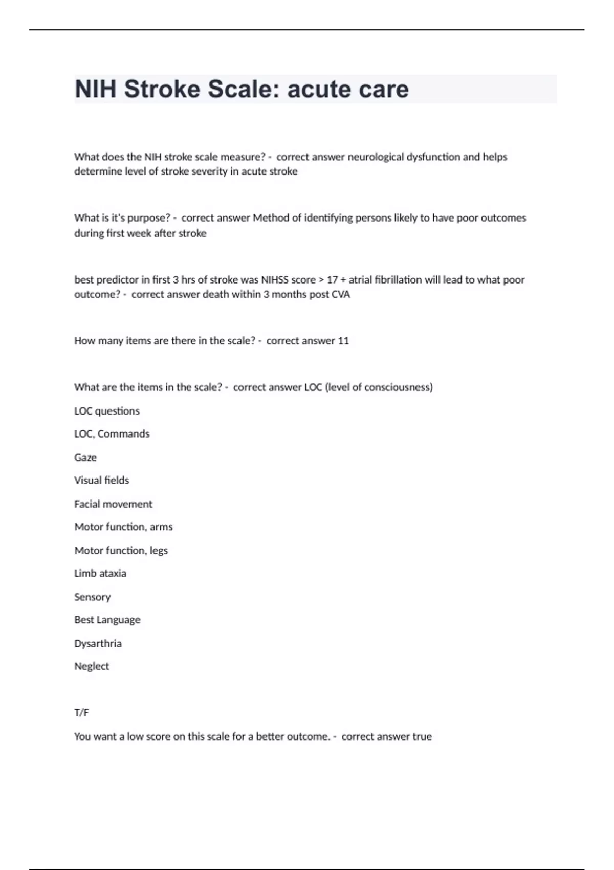 NIH Stroke Scale: acute careWhat does the NIH stroke scale measure? - correct answer neurological dysfunction and helps determine level of stroke severity in acute stroke What is it's purpose? - correct answer Method of identifying persons likely to have poor outcomes during first week after stroke best predictor in first 3 hrs of stroke was NIHSS score > 17 + atrial fibrillation will lead to what poor outcome? - correct answer death within 3 months post CVA How many items are there in the scale? - correct answer 11 What are the items in the scale? - correct answer LOC (level of consciousness) LOC questions LOC, Commands Gaze Visual fields Facial movement Motor function, arms Motor function, legs Limb ataxia Sensory Best Language Dysarthria Neglect T/F You want a low score on this scale for a better outcome. - correct answer true