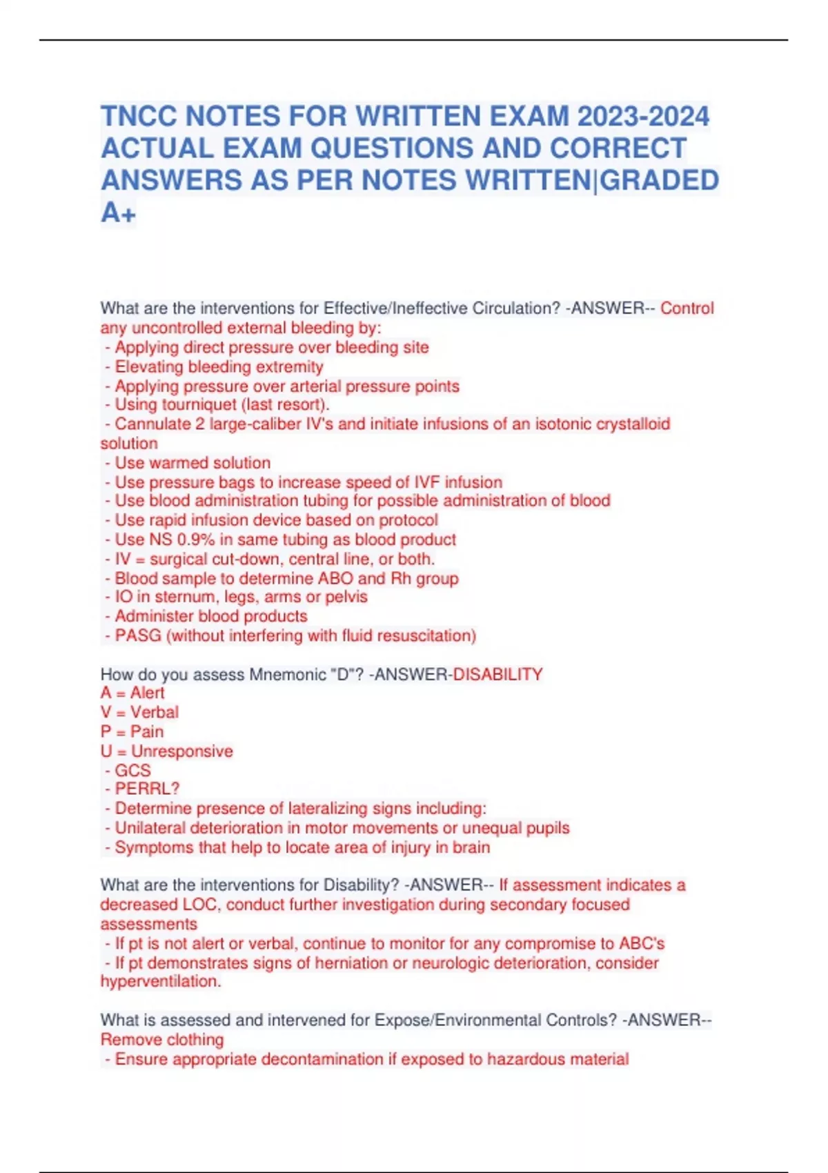 TNCC NOTES FOR WRITTEN EXAM ACTUAL EXAM QUESTIONS AND CORRECT ANSWERS AS PER NOTES WRITTEN|GRADED A+