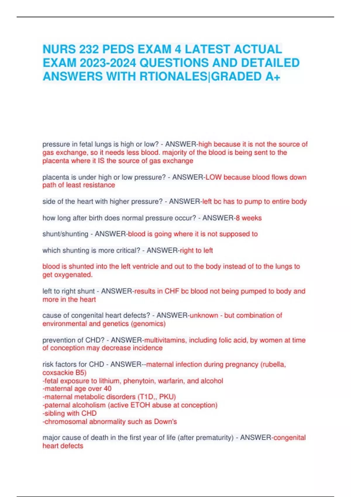 NURS 232 PEDS EXAM 4 LATEST ACTUAL EXAM QUESTIONS AND DETAILED ANSWERS WITH RTIONALES|GRADED A+