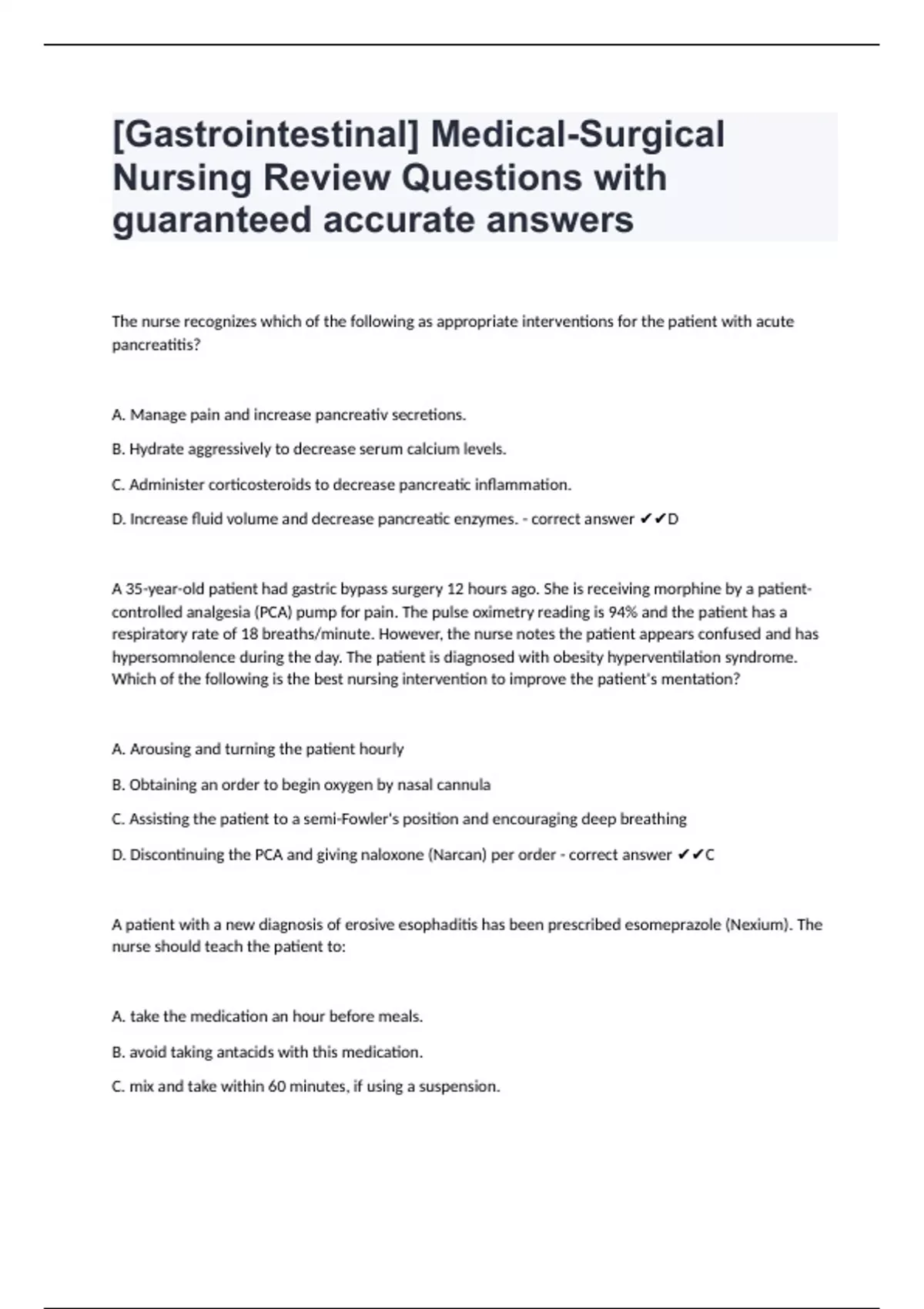 The nurse recognizes which of the following as appropriate interventions for the patient with acute pancreatitis? A. Manage pain and increase pancreativ secretions. B. Hydrate aggressively to decrease serum calcium levels. C. Administer corticosteroids to decrease pancreatic inflammation. D. Increase fluid volume and decrease pancreatic enzymes. - correct answer D A 35-year-old patient had gastric bypass surgery 12 hours ago. She is receiving morphine by a patient-controlled analgesia (PCA) pump for pain. The pulse oximetry reading is 94% and the patient has a respiratory rate of 18 breaths/minute. However, the nurse notes the patient appears confused and has hypersomnolence during the day. The patient is diagnosed with obesity hyperventilation syndrome. Which of the following is the best nursing intervention to improve the patient's mentation? A. Arousing and turning the patient hourly B. Obtaining an order to begin oxygen by nasal cannula C. Assisting the patient to a semi-Fowler's position and encouraging deep breathing D. Discontinuing the PCA and giving naloxone (Narcan) per order - correct answer C A patient with a new diagnosis of erosive esophaditis has been prescribed esomeprazole (Nexium). The nurse should teach the patient to: A. take the medication an hour before meals. B. avoid taking antacids with this medication. C. mix and take within 60 minutes, if using a suspension. D. crush caplets and mix with applesauce if swallowing is difficult. - correct answer A A patient is admitted to the medical-surgical unit with abdominal pain radiating to the right shoulder. The patient also complains of nausea and vomiting. A tentative diagnosis of cholecytitis with cholelithiasis has been made and the nurse prepares the patient for hepatobiliary imminodiacetic acid (HIDA) scanning. The nurse should instruct the patient to: A. take the radioactive tracer by mouth prior to the procedure. B. fast for 4 hours prior to the procedure. C. limit fluids following the study. D. take opio