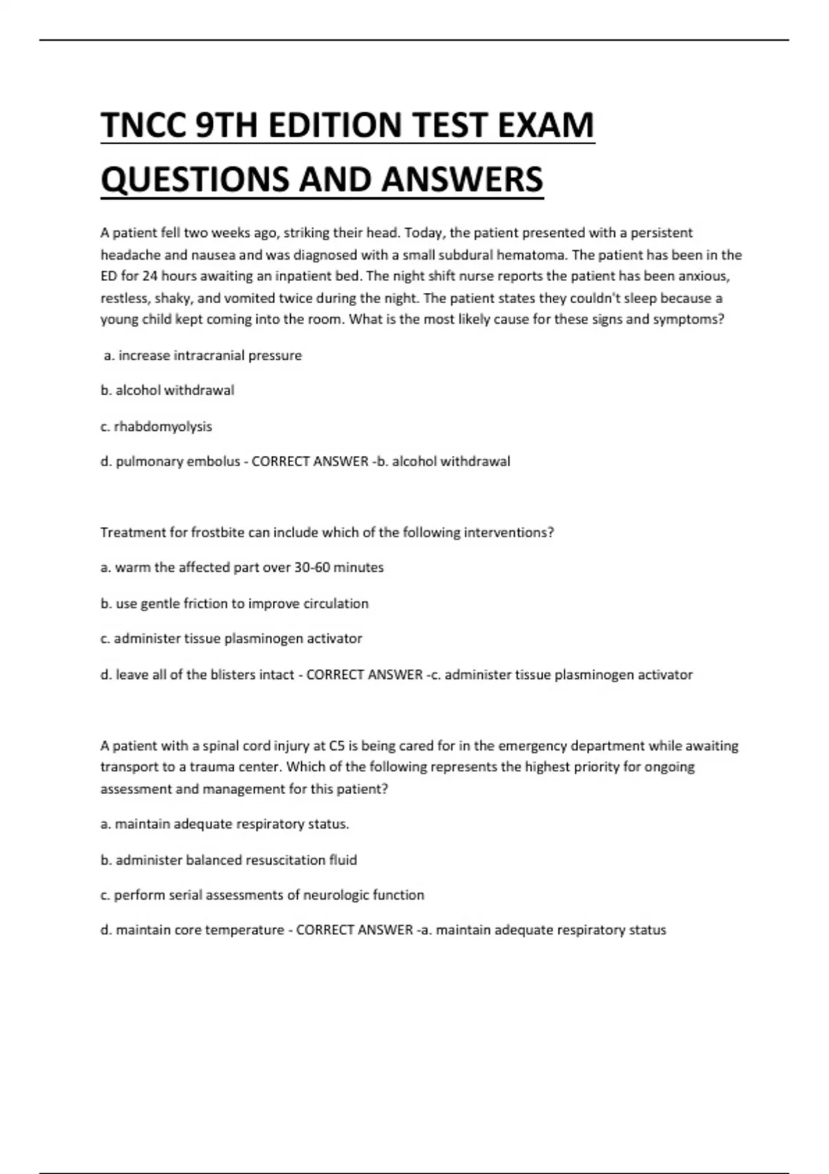 TNCC 9TH EDITION TEST EXAM QUESTIONS AND ANSWERS A patient fell two weeks ago, striking their head. Today, the patient presented with a persistent headache and nausea and was diagnosed with a small subdural hematoma. The patient has been in the ED for 24 hours awaiting an inpatient bed. The night shift nurse reports the patient has been anxious, restless, shaky, and vomited twice during the night. The patient states they couldn't sleep because a young child kept coming into the room. What is the most likely cause for these signs and symptoms? a. increase intracranial pressure b. alcohol withdrawal c. rhabdomyolysis d. pulmonary embolus - CORRECT ANSWER -b. alcohol withdrawal Treatment for frostbite can include which of the following interventions? a. warm the affected part over 30-60 minutes b. use gentle friction to improve circulation c. administer tissue plasminogen activator d. leave all of the blisters intact - CORRECT ANSWER -c. administer tissue plasminogen activator A patient with a spinal cord injury at C5 is being cared for in the emergency department while awaiting transport to a trauma center. Which of the following represents the highest priority for ongoing assessment and management for this patient? a. maintain adequate respiratory status. b. administer balanced resuscitation fluid c. perform serial assessments of neurologic function d. maintain core temperature - CORRECT ANSWER -a. maintain adequate respiratory status