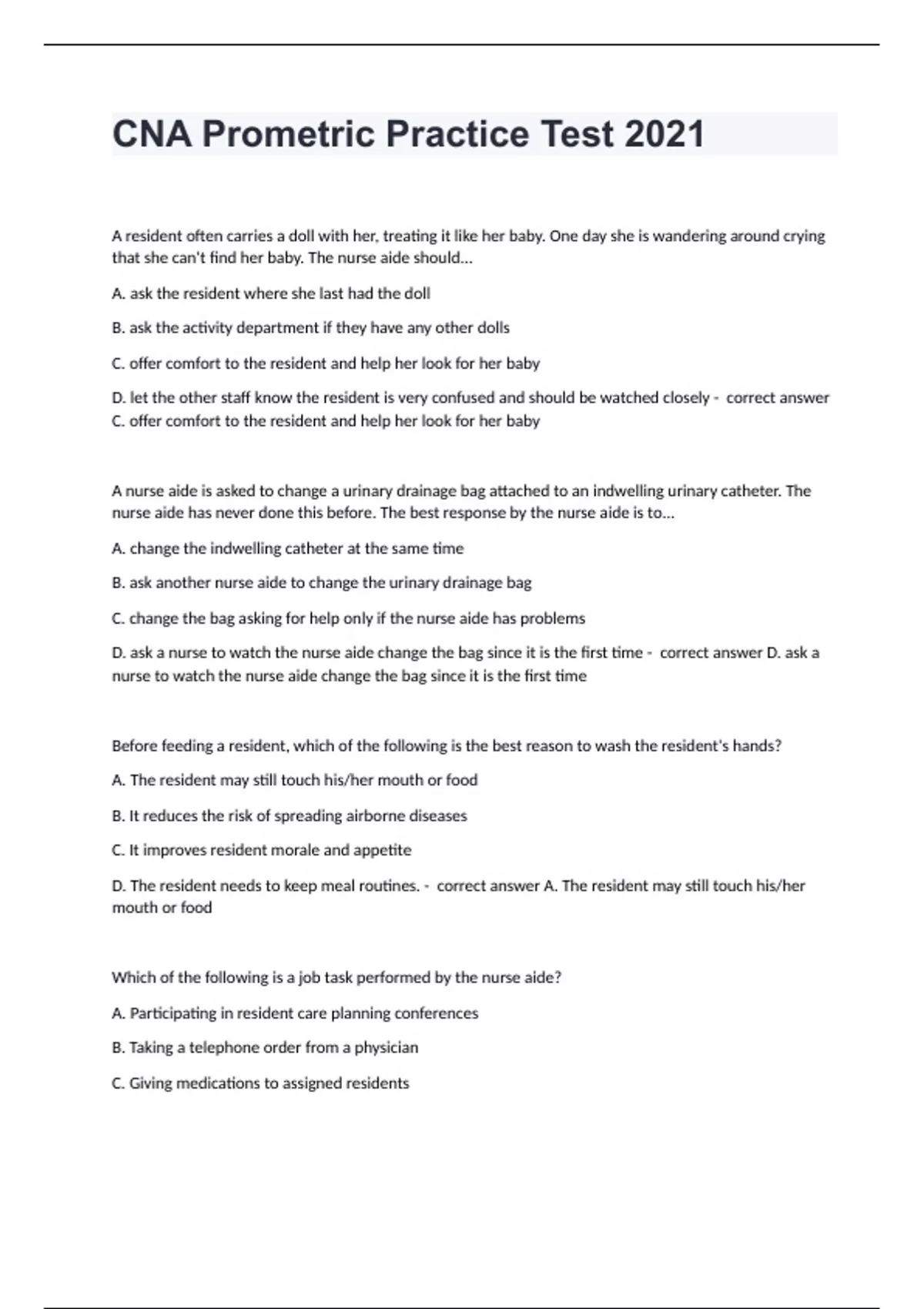 CNA Prometric Practice Test 2021 A resident often carries a doll with her, treating it like her baby. One day she is wandering around crying that she can't find her baby. The nurse aide should... A. ask the resident where she last had the doll B. ask the activity department if they have any other dolls C. offer comfort to the resident and help her look for her baby D. let the other staff know the resident is very confused and should be watched closely - correct answer C. offer comfort to the resident and help her look for her baby A nurse aide is asked to change a urinary drainage bag attached to an indwelling urinary catheter. The nurse aide has never done this before. The best response by the nurse aide is to... A. change the indwelling catheter at the same time B. ask another nurse aide to change the urinary drainage bag C. change the bag asking for help only if the nurse aide has problems D. ask a nurse to watch the nurse aide change the bag since it is the first time - correct answer D. ask a nurse to watch the nurse aide change the bag since it is the first time Before feeding a resident, which of the following is the best reason to wash the resident's hands? A. The resident may still touch his/her mouth or food B. It reduces the risk of spreading airborne diseases C. It improves resident morale and appetite D. The resident needs to keep meal routines. - correct answer A. The resident may still touch his/her mouth or food Which of the following is a job task performed by the nurse aide? A. Participating in resident care planning conferences B. Taking a telephone order from a physician C. Giving medications to assigned residents D. Changing sterile wound dressings - correct answer A. Participating in resident care planning conferences Which of the following statements is true about range of motion (ROM) exercises? A. Done just once a day B. Help prevent strokes and paralysis C. Require at least ten repetitions of each exercise D. Are often performed during ADLs such as bathing or dressing - correct answer D. Are often performed during ADLs such as bathing or dressing While the nurse aide tries to dress a resident who is confused, the resident keeps trying to grab a hairbrush. The nurse aide should... A. put the hairbrush away and out of sight B. give the resident the hairbrush to hold C. try to dress the resident more quickly D. restrain the resident's hand - correct answer B. give the resident the hairbrush to hold A resident who is lying in bed suddenly becomes short of breath. After calling for help, the nurse aide's next action should be to... A. ask the resident to take deep breaths B. take the resident's vital signs C. raise the head of the bed D. elevate the resident's feet - correct answer C. raise the head of the bed A resident who has cancer is expected to die within the next couple of days. Nursing care for this resident should focus on... A. helping the resident through the stages of grief B. providing for the resident's comfort C. keeping the resident's care routine, such as for bathing D. giving the resident a lot of quiet time and privacy - correct answer B. providing for the resident's comfort
