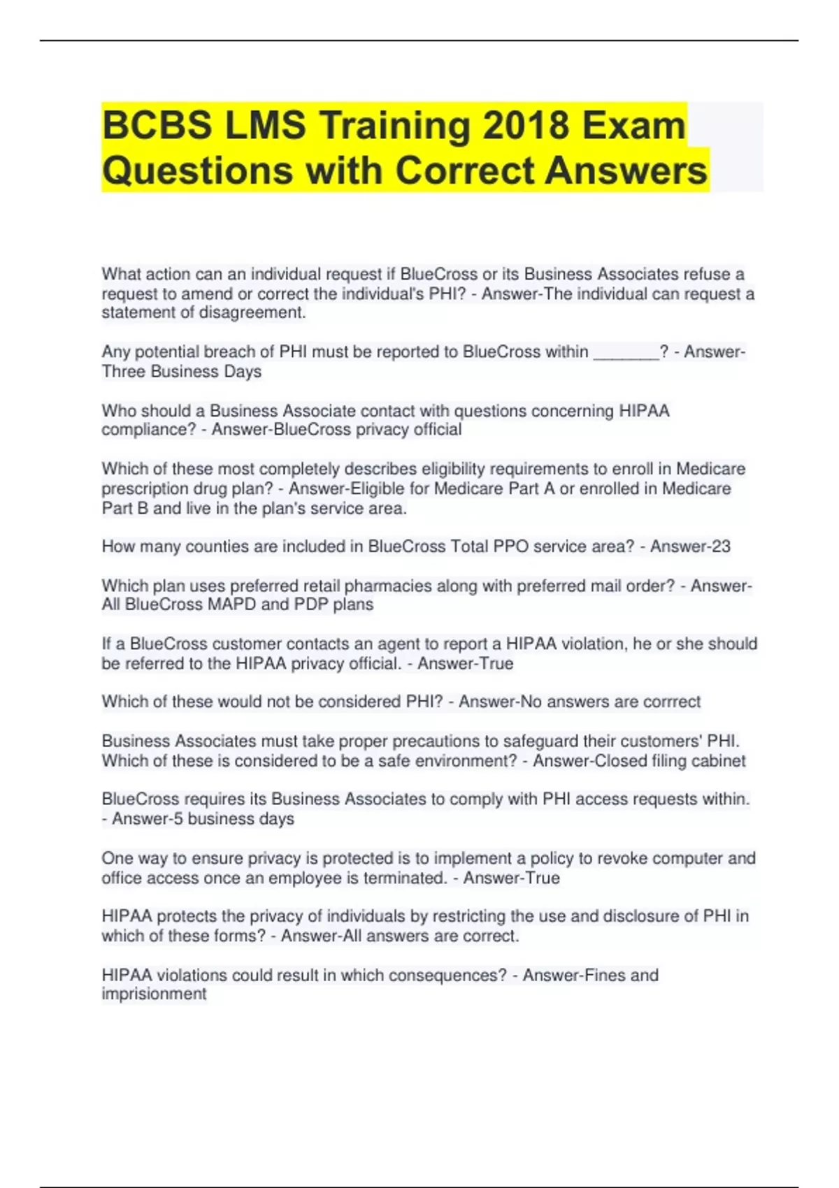 BCBS LMS Training 2018 Exam Questions with Correct Answers What action can an individual request if BlueCross or its Business Associates refuse a request to amend or correct the individual's PHI? - Answer-The individual can request a statement of disagreement. Any potential breach of PHI must be reported to BlueCross within _______? - AnswerThree Business Days Who should a Business Associate contact with questions concerning HIPAA compliance? - Answer-BlueCross privacy official Which of these most completely describes eligibility requirements to enroll in Medicare prescription drug plan? - Answer-Eligible for Medicare Part A or enrolled in Medicare Part B and live in the plan's service area. How many counties are included in BlueCross Total PPO service area? - Answer-23 Which plan uses preferred retail pharmacies along with preferred mail order? - AnswerAll BlueCross MAPD and PDP plans If a BlueCross customer contacts an agent to report a HIPAA violation, he or she should be referred to the HIPAA privacy official. - Answer-True Which of these would not be considered PHI? - Answer-No answers are corrrect