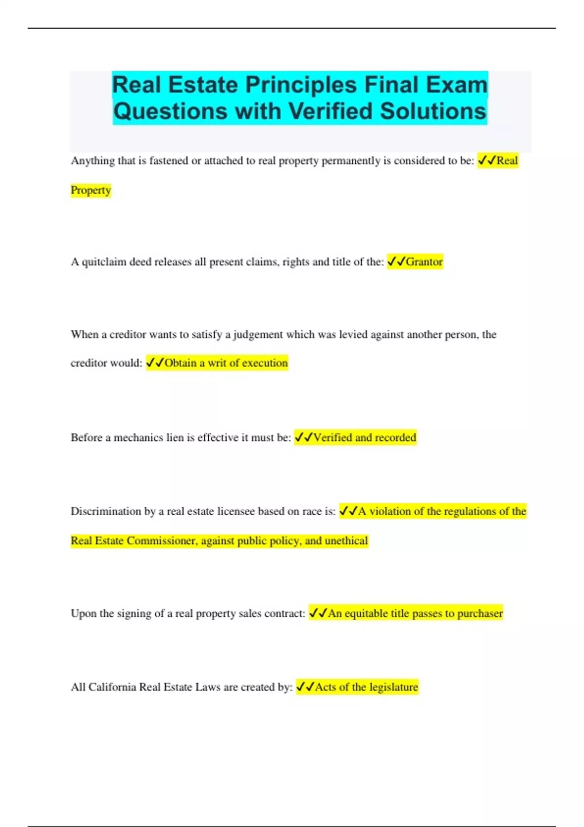 Real Estate Principles Final Exam Questions with Verified Solutions Anything that is fastened or attached to real property permanently is considered to be: Real Property A quitclaim deed releases all present claims, rights and title of the: Grantor When a creditor wants to satisfy a judgement which was levied against another person, the creditor would: Obtain a writ of execution Before a mechanics lien is effective it must be: Verified and recorded Discrimination by a real estate licensee based on race is: A violation of the regulations of the Real Estate Commissioner, against public policy, and unethical Upon the signing of a real property sales contract: An equitable title passes to purchaser All California Real Estate Laws are created by: Acts of the legislature The 36 sections in a township are numbered from 1 through 36. Section 1 is located in the: Northeast corner Which of the following would be a discriminatory act under the Commissioner's Regulations? Posting a sign on the property indicating a preference for female renters, designing an ad for general circulation appealing to persons of a specific religion to purchase within a given area, and refusing to list a property in an area occupied by persons of a race other than the licensee. The type of interest usually charged on home loans is: Simple A landowner is notified by a railroad company that it plans to cross his property with a railroad line. If the landowner refuses, the railroad company can proceed by the use of: Eminent domain Title to real property that is transferred by a will is considered: A devise A real estate broker received 40 acres of land valued at $300 per acre as a commission from the seller. Two weeks after escrow closed, the broker was offered $400 per acre for the land. If the broker accepts the offer he: Will be acting in an acceptable manner The words "procuring cause" would have an important meaning to which of the following? A disputed over commission on an open listing Which of the following is not an essential element of a contract? Performance Under the Street Improvement Act of 1911, the city is authorized to assess each owner for the work completed. These improvements are assessed on the basis of: Front footage The real estate tax fiscal year is for the period: July 1 to July 1 The landmark case of the United States Supreme Court which prohibited discrimination in housing was: Jones vs. Mayer Most real estate syndicates that have been created in California have taken the form of a: Limited partnership Under the California Veterans Home and Farm Purchase Act of 1974, the purchaser acquired possession through a: Land Contract
