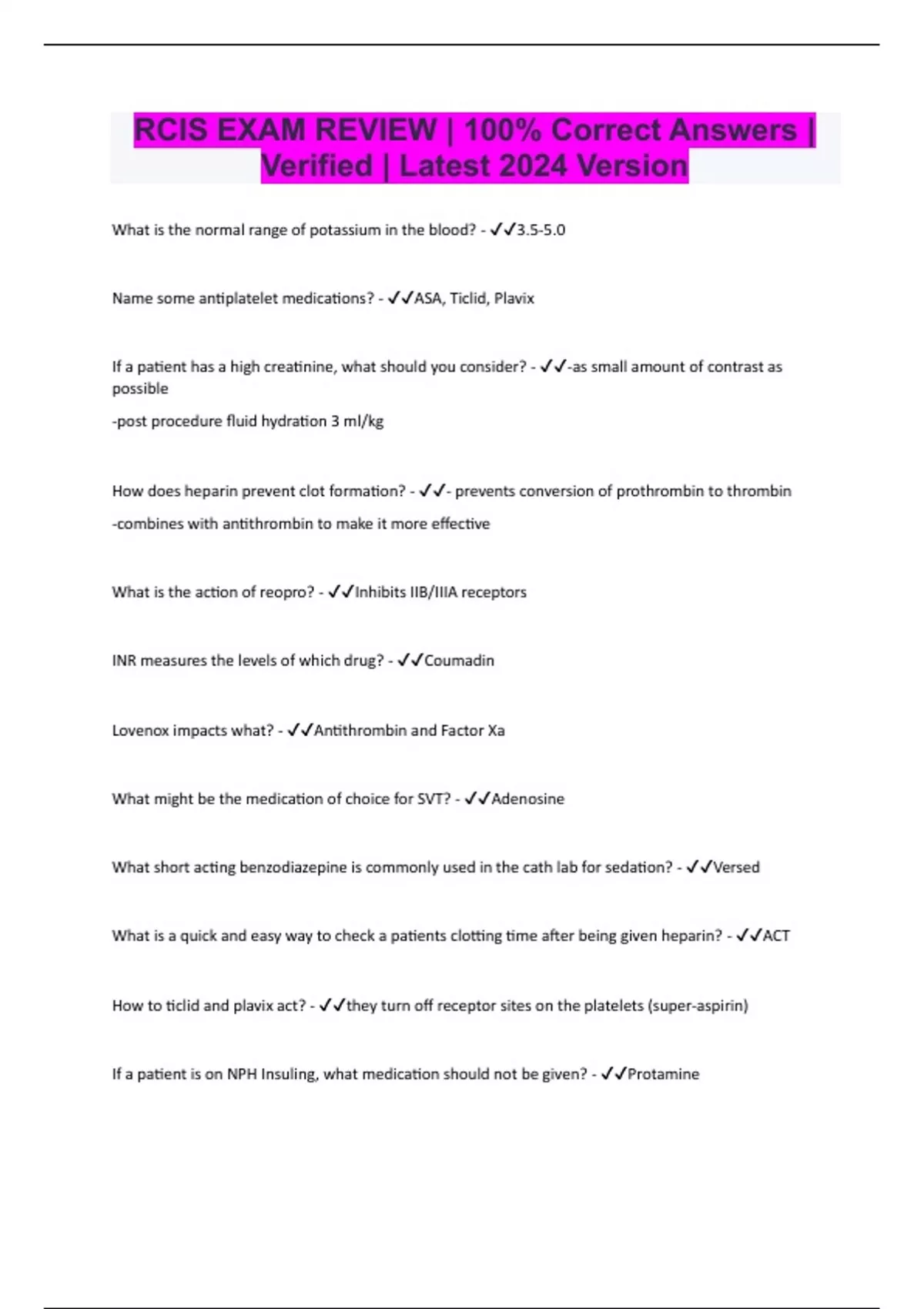 What is the normal range of potassium in the blood? - 3.5-5.0 Name some antiplatelet medications? - ASA, Ticlid, Plavix If a patient has a high creatinine, what should you consider? - -as small amount of contrast as possible -post procedure fluid hydration 3 ml/kg How does heparin prevent clot formation? - - prevents conversion of prothrombin to thrombin -combines with antithrombin to make it more effective What is the action of reopro? - Inhibits IIB/IIIA receptors INR measures the levels of which drug? - Coumadin Lovenox impacts what? - Antithrombin and Factor Xa What might be the medication of choice for SVT? - Adenosine What short acting benzodiazepine is commonly used in the cath lab for sedation? - Versed What is a quick and easy way to check a patients clotting time after being given heparin? - ACT