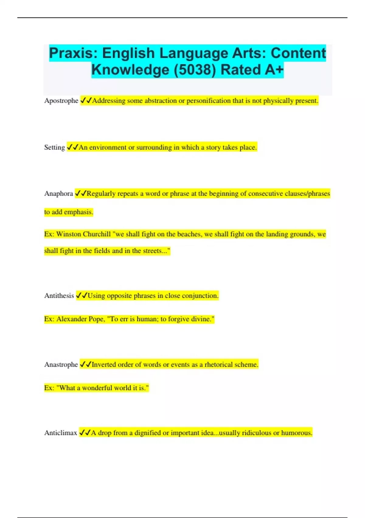 Praxis: English Language Arts: Content Knowledge (5038) Rated A+ Apostrophe Addressing some abstraction or personification that is not physically present. Setting An environment or surrounding in which a story takes place. Anaphora Regularly repeats a word or phrase at the beginning of consecutive clauses/phrases to add emphasis. Ex: Winston Churchill "we shall fight on the beaches, we shall fight on the landing grounds, we shall fight in the fields and in the streets..." Antithesis Using opposite phrases in close conjunction. Ex: Alexander Pope, "To err is human; to forgive divine." Anastrophe Inverted order of words or events as a rhetorical scheme. Ex: "What a wonderful world it is." Anticlimax A drop from a dignified or important idea...usually ridiculous or humorous. Anecdote A brief story authors may relate, which can illustrate their points in a more relatable way. Archetype Universal symbol Symbolism Use of symbols to signify ideas and qualities by giving them symbolic meanings that are different from their literal sense. Tone The attitude of a writer toward a subject or an audience. Voice A form or format through which the narrator/author tells their story. Reflects individual writing style. Alliteration The occurrence of the same letter or sound at then beginning of adjacent or closely connected word. Consonance: bake, duck, soak, pick Assonance: meek, beam, peace, reap pier Allusion Expression designed to call something to mind without mentioning it explicitly (a hint, a reference to). For example: "Don't be such a Romeo around her". Analogy Comparison between two things--usually for the purpose of explanation or clarity. Ex: similes, metaphors Blank Verse Unrhymed iambic pentameter - lines of 10 syllables that don't rhyme, each even-numbered syllable has an accent. Burlesque Ridicules a topic by treating something exalted as if it were trivial, and vice versa. Caesura A pause. Sometimes signified by a slash or a comma. Chiasmus Uses parallel clauses, the second reversing the order of the first. Ex: JFK "Ask not what your country can do for you; ask what you can do for your country." Catastrophe The "turning downward" of a plot in a tragedy - usually in the 4th act, after the climax. Catharsis Events that bring about a moral or spiritual renewal. Relief from tension. Cliché Trite phrase that has become overused. Connotation Emotional meaning of a word, plus it's literal meaning. Consonance A type of alliteration where the consonants stay the same but the vowels change. Denotation The literal meaning