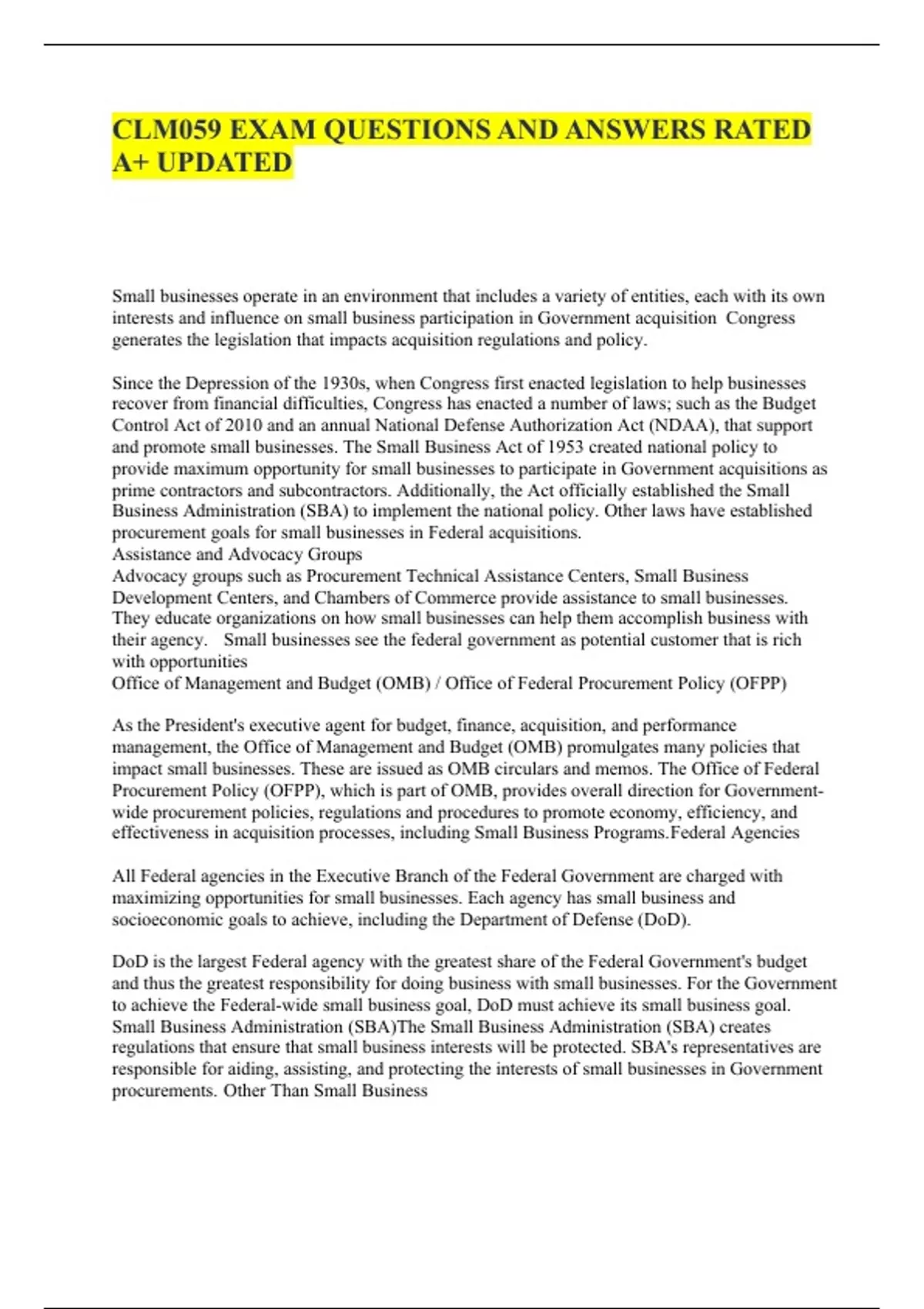 CLM059 EXAM QUESTIONS AND ANSWERS RATED A+ UPDATED Small businesses operate in an environment that includes a variety of entities, each with its own interests and influence on small business participation in Government acquisition Congress generates the legislation that impacts acquisition regulations and policy. Since the Depression of the 1930s, when Congress first enacted legislation to help businesses recover from financial difficulties, Congress has enacted a number of laws; such as the Budget Control Act of 2010 and an annual National Defense Authorization Act (NDAA), that support and promote small businesses. The Small Business Act of 1953 created national policy to provide maximum opportunity for small businesses to participate in Government acquisitions as prime contractors and subcontractors. Additionally, the Act officially established the Small Business Administration (SBA) to implement the national policy. Other laws have established procurement goals for small businesses in Federal acquisitions. Assistance and Advocacy Groups Advocacy groups such as Procurement Technical Assistance Centers, Small Business Development Centers, and Chambers of Commerce provide assistance to small businesses. They educate organizations on how small businesses can help them accomplish business with their agency. Small businesses see the federal government as potential customer that is rich with opportunities Office of Management and Budget (OMB) / Office of Federal Procurement Policy (OFPP) As the President's executive agent for budget, finance, acquisition, and performance management, the Office of Management and Budget (OMB) promulgates many policies that impact small businesses. These are issued as OMB circulars and memos. The Office of Federal Procurement Policy (OFPP), which is part of OMB, provides overall direction for Government-wide procurement policies, regulations and procedures to promote economy, efficiency, and effectiveness in acquisition processes, including Small Business Programs. Federal Agencies All Federal agencies in the Executive Branch of the Federal Government are charged with maximizing opportunities for small businesses. Each agency has small business and socioeconomic goals to achieve, including the Department of Defense (DoD). DoD is the largest Federal agency with the greatest share of the Federal Government's budget and thus the greatest responsibility for doing business with small businesses. For the Government to achieve the Federal-wide small business goal, DoD must achieve its small business goal. Small Business Administration (SBA)The Small Business Administration (SBA) creates regulations that ensure that small business interests will be protected. SBA's representatives are responsible for aiding, assisting, and protecting the interests of small businesses in Government procurements. Other Than Small Business While large businesses, educational institutions, non-profits and other entities that are not small businesses may view small businesses as privileged competitors, they also recognize that there are benefits in partnering with small businesses in Government contracts. Small businesses are important to our nation; they strengthen the foundation of our economic security and industrial base. Additionally, small businesses are just as important to DoD. Because small businesses are nimble and can respond rapidly to our needs, they can help DoD realize greater efficiency and flexibility, take advantage of innovative technologies and approaches, and improve military readiness. Small businesses drive economic growth in the United States. The Small Business Administration (SBA), Office of Advocacy, is the statistical arm of SBA. Part of their mission is to conduct, sponsor, and promote economic research that provides an environment for small business growth.