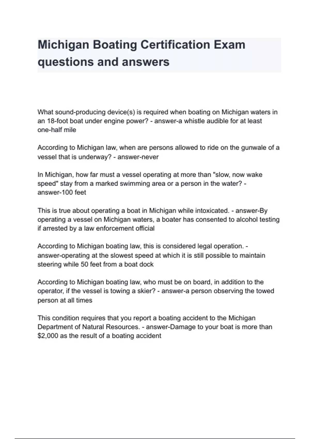 Michigan Boating Certification Exam questions and answers