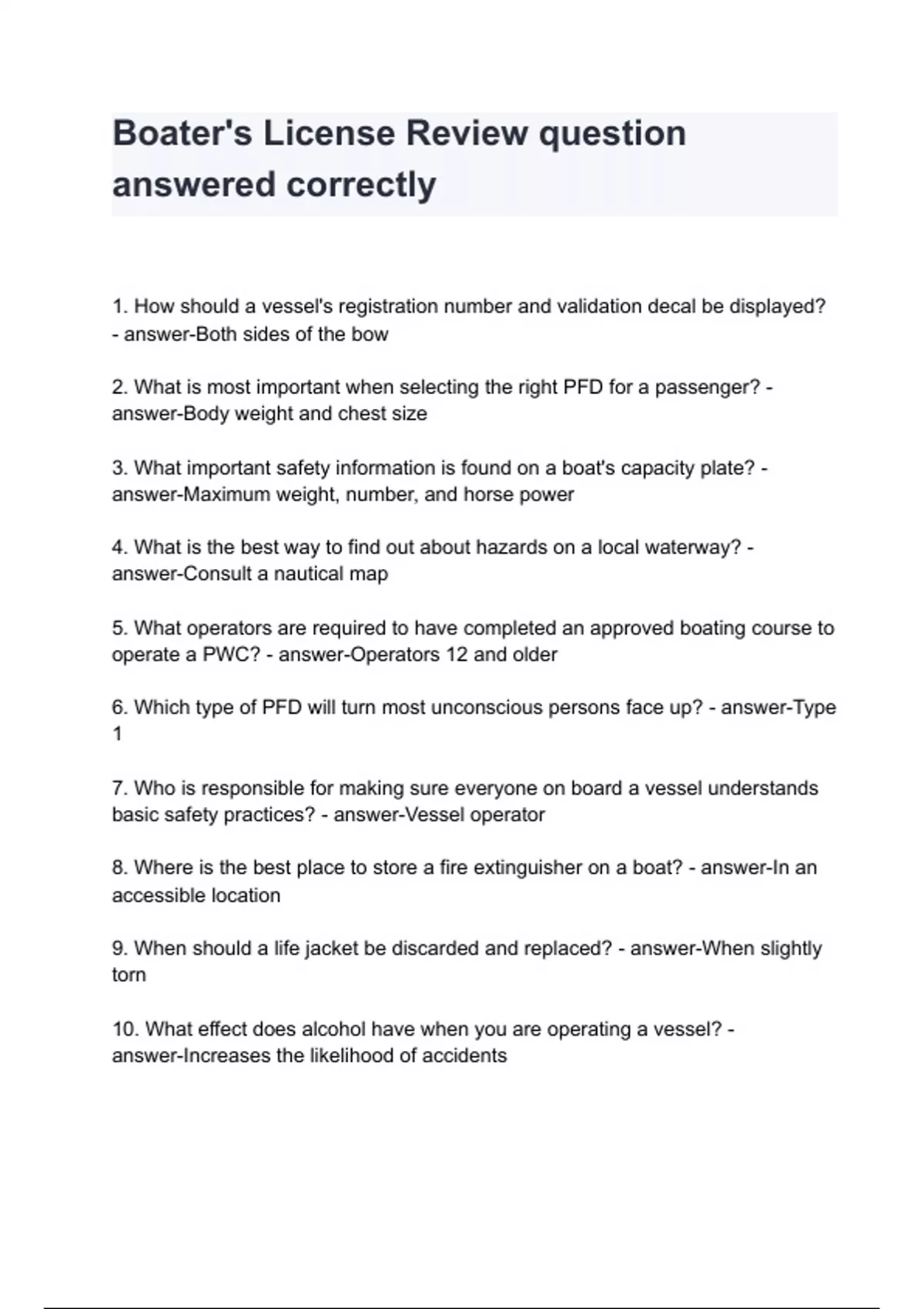 1. How should a vessel's registration number and validation decal be displayed? - answer-Both sides of the bow 2. What is most important when selecting the right PFD for a passenger? - answer-Body weight and chest size 3. What important safety information is found on a boat's capacity plate? - answer-Maximum weight, number, and horse power 4. What is the best way to find out about hazards on a local waterway? - answer-Consult a nautical map 5. What operators are required to have completed an approved boating course to operate a PWC? - answer-Operators 12 and older 6. Which type of PFD will turn most unconscious persons face up? - answer-Type 1 7. Who is responsible for making sure everyone on board a vessel understands basic safety practices? - answer-Vessel operator 8. Where is the best place to store a fire extinguisher on a boat? - answer-In an accessible location 9. When should a life jacket be discarded and replaced? - answer-When slightly torn 10. What effect does alcohol have when you are operating a vessel? - answer