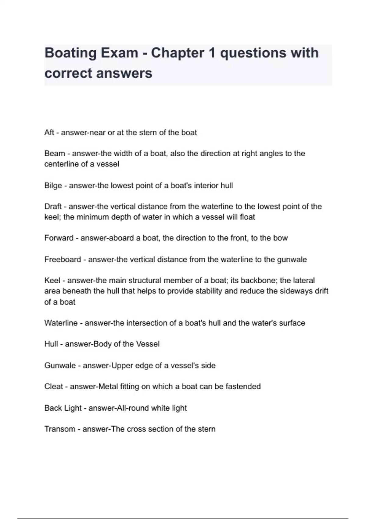 Aft - answer-near or at the stern of the boat Beam - answer-the width of a boat, also the direction at right angles to the centerline of a vessel Bilge - answer-the lowest point of a boat's interior hull Draft - answer-the vertical distance from the waterline to the lowest point of the keel; the minimum depth of water in which a vessel will float Forward - answer-aboard a boat, the direction to the front, to the bow Freeboard - answer-the vertical distance from the waterline to the gunwale Keel - answer-the main structural member of a boat; its backbone; the lateral area beneath the hull that helps to provide stability and reduce the sideways drift of a boat Waterline - answer-the intersection of a boat's hull and the water's surface Hull - answer-Body of the Vessel Gunwale - answe