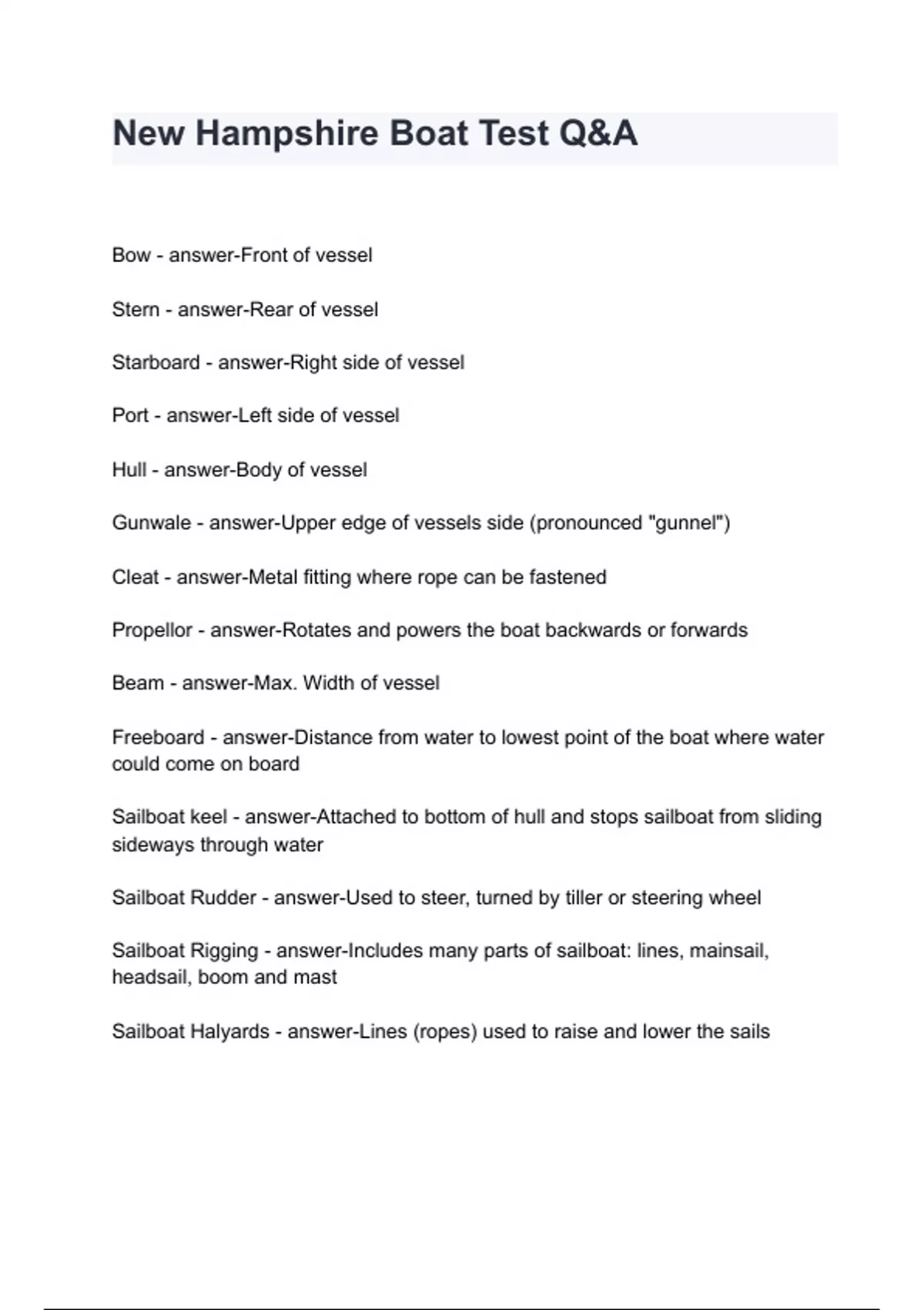 Bow - answer-Front of vessel Stern - answer-Rear of vessel Starboard - answer-Right side of vessel Port - answer-Left side of vessel Hull - answer-Body of vessel Gunwale - answer-Upper edge of vessels side (pronounced "gunnel") Cleat - answer-Metal fitting where rope can be fastened Propellor - answer-Rotates and powers the boat backwards or forwards Beam - answer-Max. Width of vessel Freeboard - answer-Distance from water to lowest point of the boat where water could come on bo