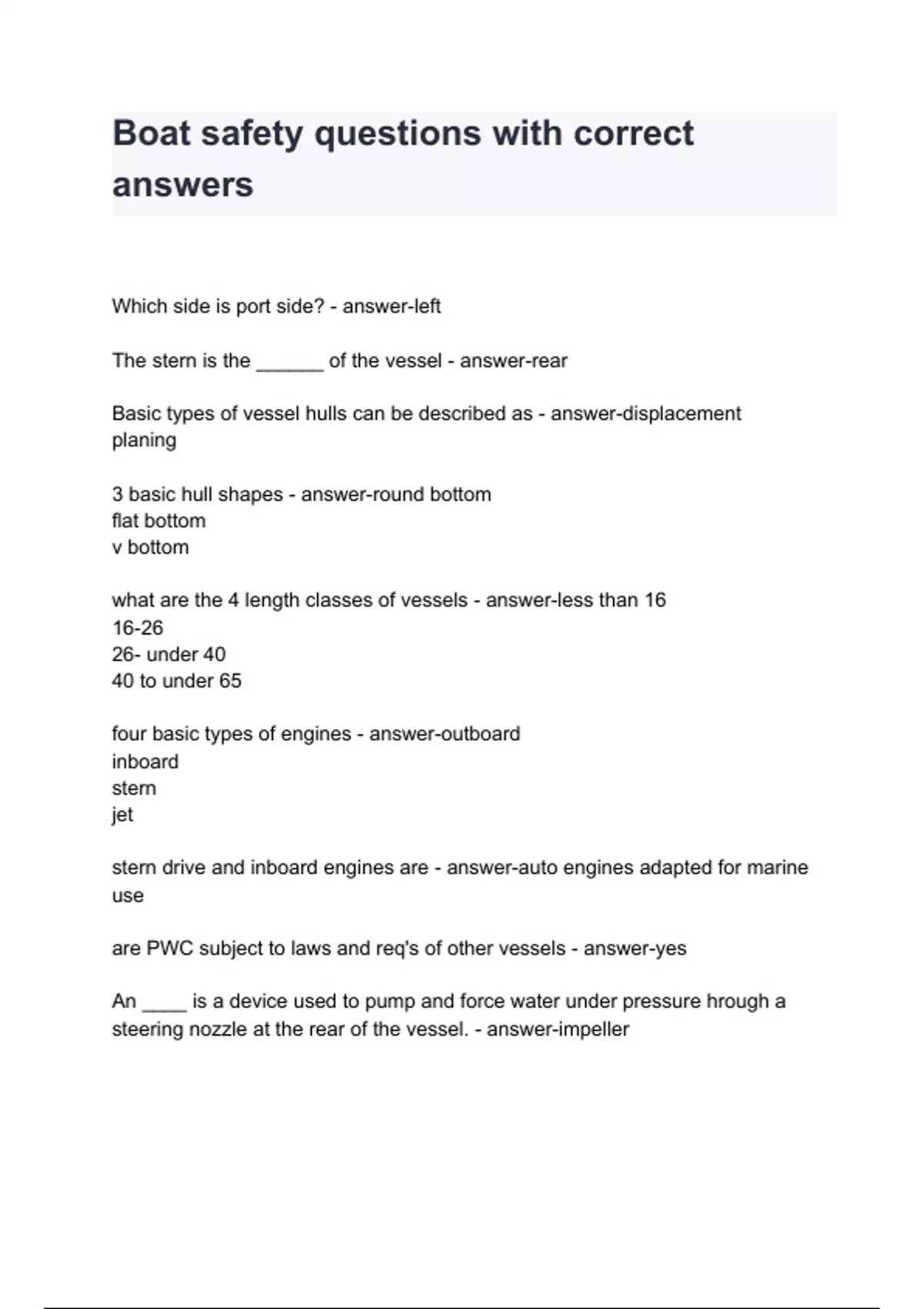 Which side is port side? - answer-left The stern is the ______ of the vessel - answer-rear Basic types of vessel hulls can be described as - answer-displacement planing 3 basic hull shapes - answer-round bottom flat bottom v bottom what are the 4 length classes of vessels - answer-less than 16 16-26 26- under 40 40 to under 65 four basic types