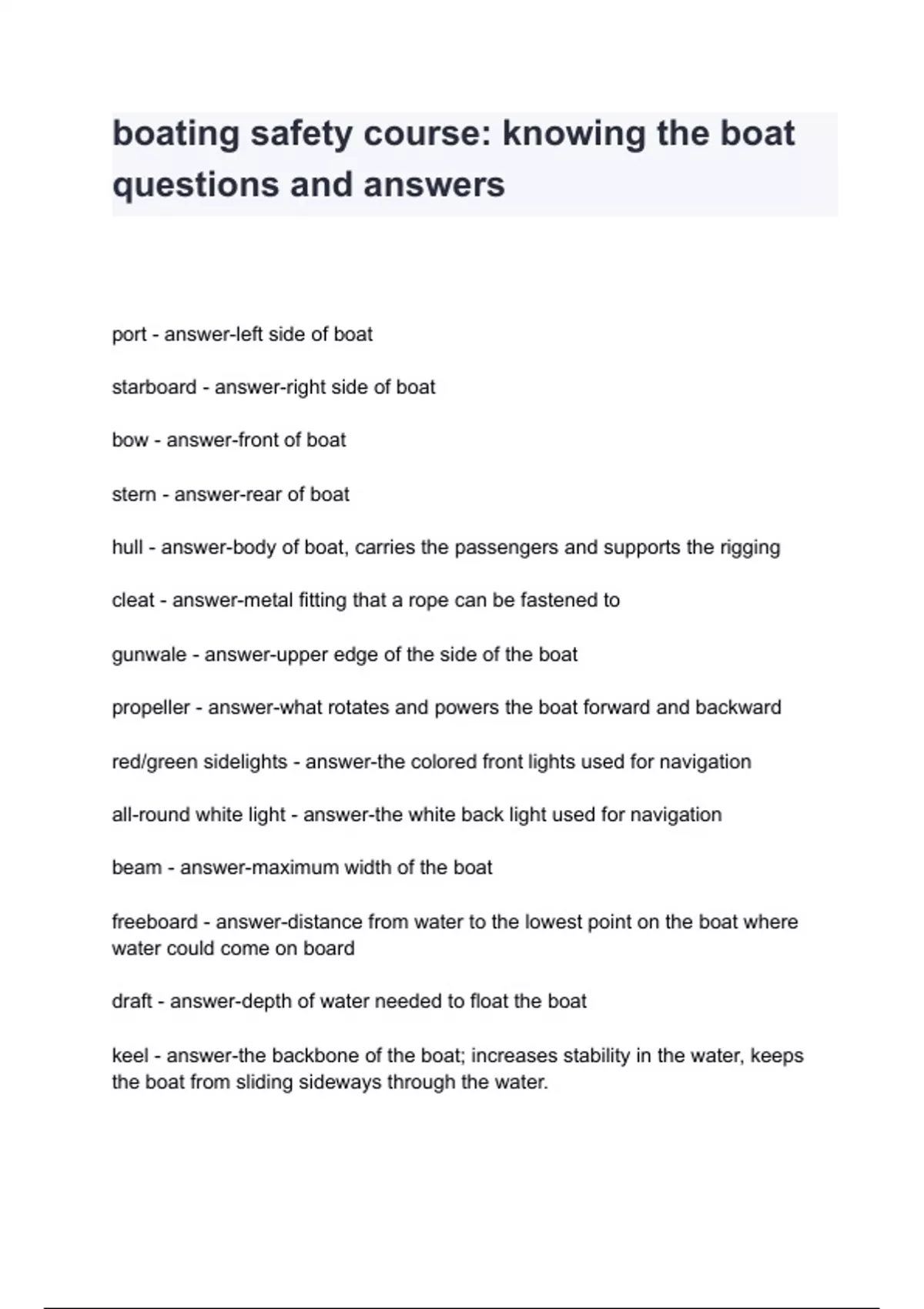 boating safety course: knowing the boat questions and answers port - answer-left side of boat starboard - answer-right side of boat bow - answer-front of boat stern - answer-rear of boat hull - answer-body of boat, carries the passengers and supports the rigging cleat - answer-metal fitting that a rope can be fastened to gunwale - a