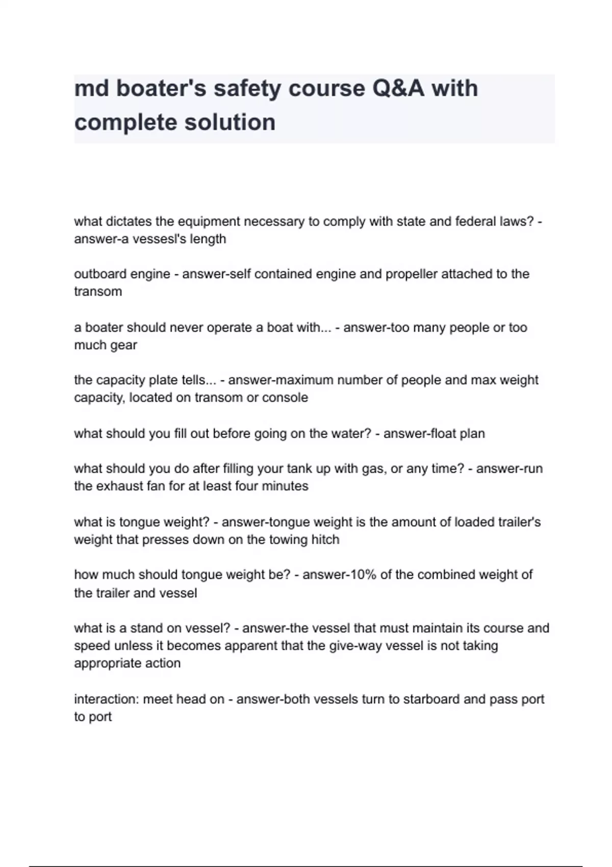 md boater's safety course Q&A with complete solution what dictates the equipment necessary to comply with state and federal laws? - answer-a vessesl's length outboard engine - answer-self contained engine and propeller attached to the transom a boater should never operate a boat with... - answer-too many people or too much gear the capacity pl
