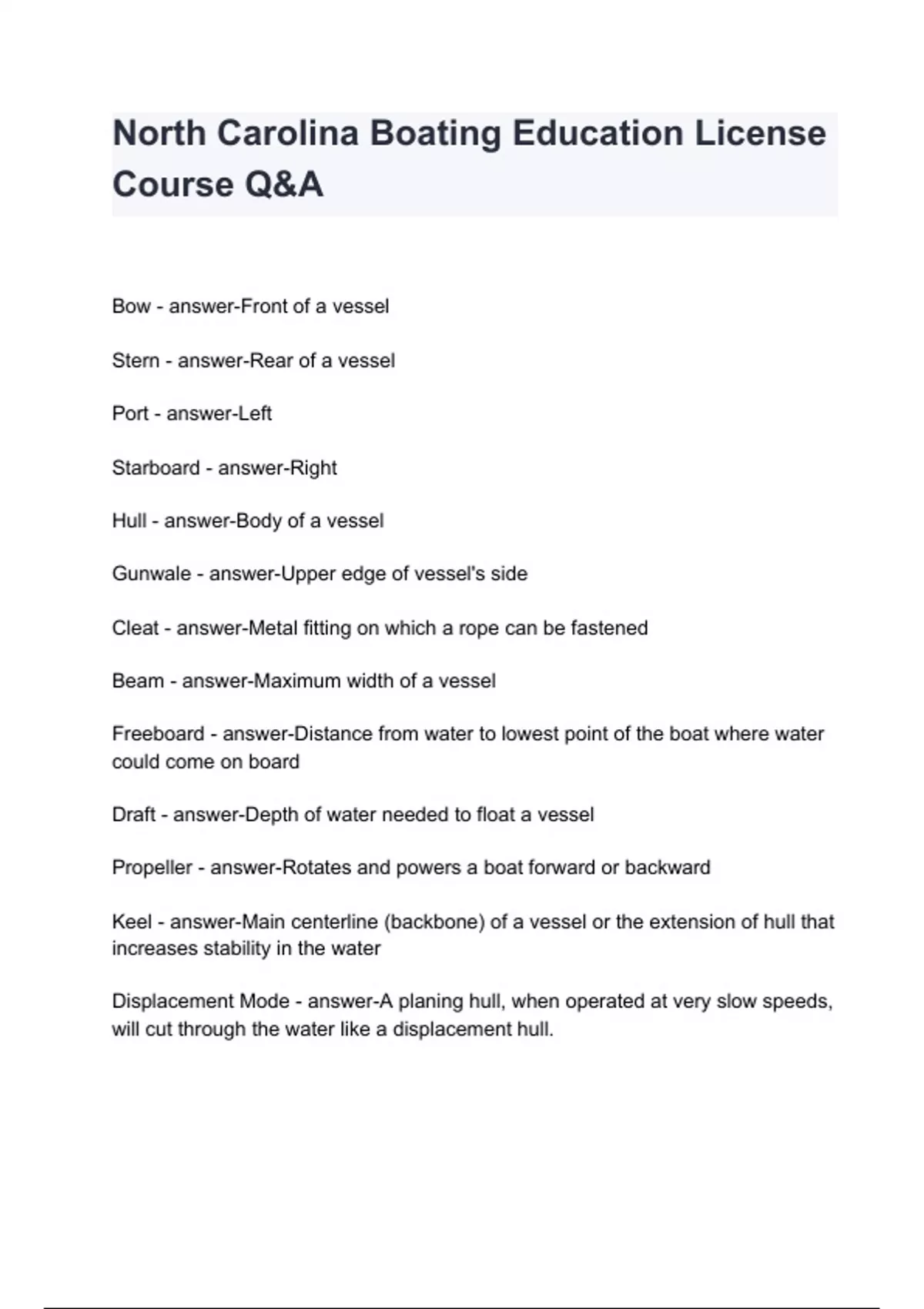 North Carolina Boating Education License Course Q&A Bow - answer-Front of a vessel Stern - answer-Rear of a vessel Port - answer-Left Starboard - answer-Right Hull - answer-Body of a vessel Gunwale - answer-Upper edge of vessel's side Cleat - answer-Metal fitting on which a rope can be fastened Beam - answer-Maximum width of a vessel Freeboard - answer-Distance from water to lowest point of the boat where water could come on board Draft - answer-Depth of water needed to float a vessel Propeller - a