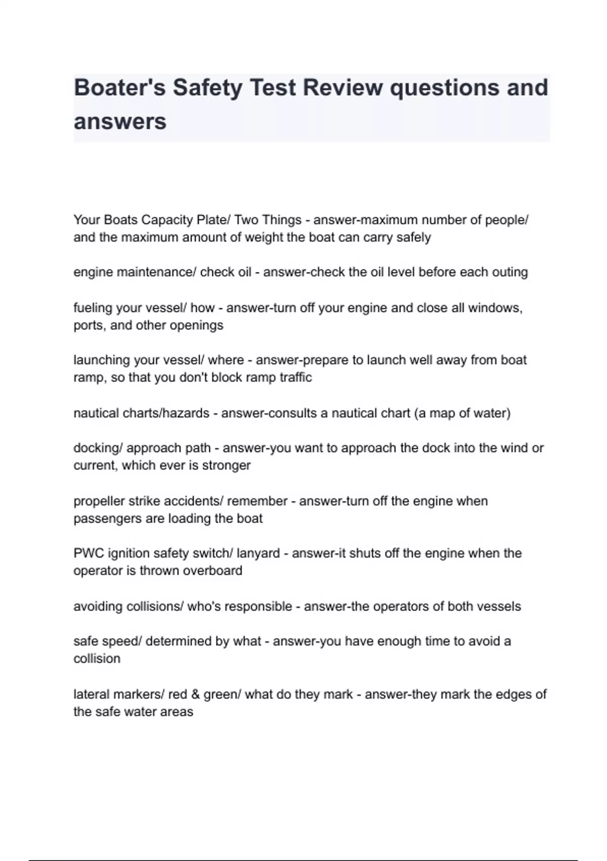 Boater's Safety Test Review questions and answers Your Boats Capacity Plate/ Two Things - answer-maximum number of people/ and the maximum amount of weight the boat can carry safely engine maintenance/ check oil - answer-check the oil level before each outing fueling your vessel/ how - answer-turn off your engine and close all windows, ports, and other openings launching your vessel/ where - answer-prepare to launch well away from boat ramp, so that you don't block ramp traffic nautical charts/hazards - answer-consults a nautical chart (a map of water) docking/ approach path - answer-you want to approach the dock into the wind or current, which ever is stronger propeller strike accidents/ remember - answer-turn off the engine when passengers are loading the boat PWC ignition s