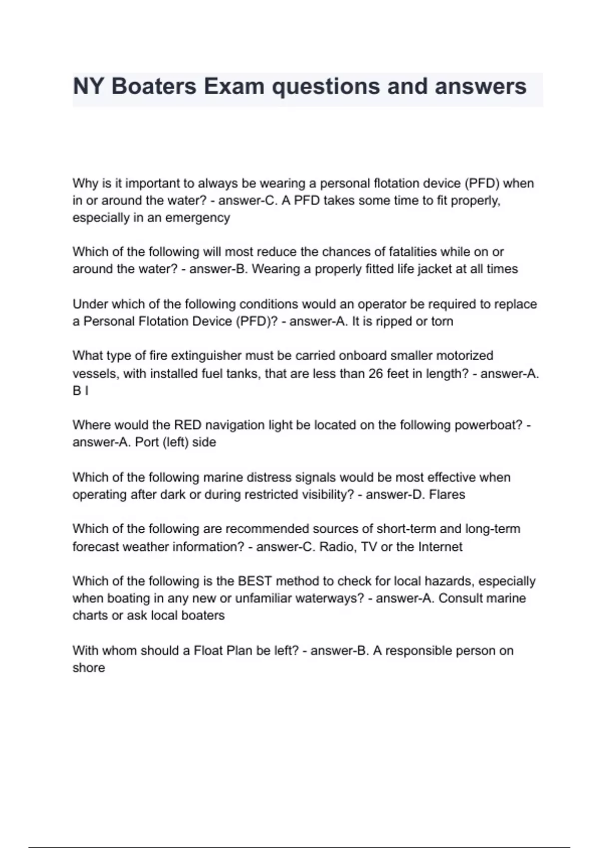 NY Boaters Exam questions and answers Why is it important to always be wearing a personal flotation device (PFD) when in or around the water? - answer-C. A PFD takes some time to fit properly, especially in an emergency Which of the following will most reduce the chances of fatalities while on or around the water? - answer-B. Wearing a properly fitted life jacket at all times Under which of the following conditions would an operator be required to replace a Personal Flotation Device (PFD)? - answer-A. It is ripped or torn What type of fire extinguisher must be carried onboard smaller motorized vessels, with installed fuel tanks, that are less than 26 feet in length? - answer-A. B I Where would the RED navigation light be located on the following powerboat? - answer-A. Port (left) side Which of the following marine distress signals would be most effective when operating after dark or during restricted visibility? - answer-D. Flares Which of the following are recommended sources of short-term and long-term forecast weather information? - answer-C. Radio, TV or the Internet Which of the following is the BEST method to check for local hazards, especially when boatin