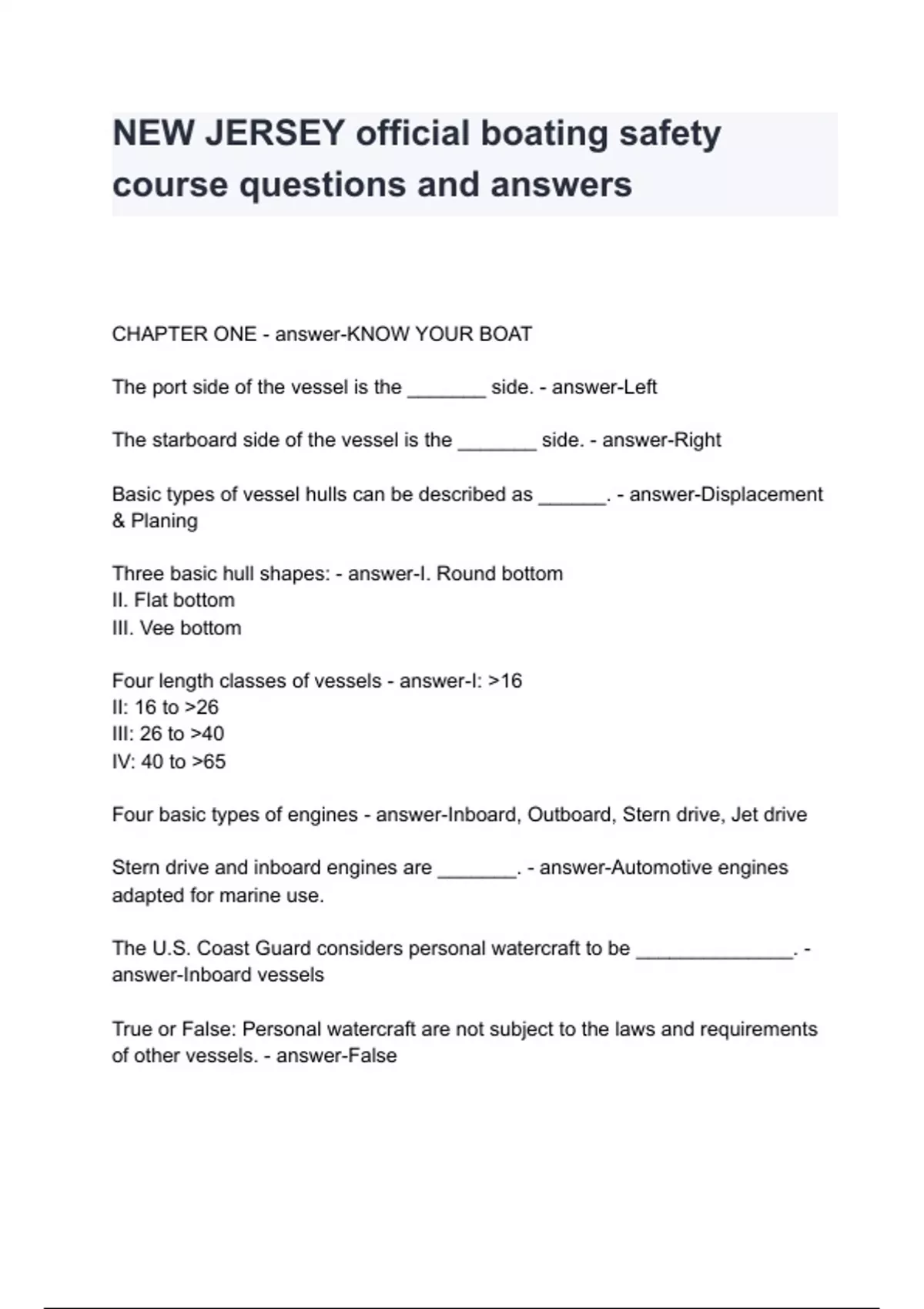 CHAPTER ONE - answer-KNOW YOUR BOAT The port side of the vessel is the _______ side. - answer-Left The starboard side of the vessel is the _______ side. - answer-Right Basic types of vessel hulls can be described as ______. - answer-Displacement & Planing Three basic hull shapes: - answer-I. Round bottom II. Flat bottom III. Vee bottom Four length classes of vessels - answer-I: >16 II: 16 to >26 III: 26 to >40 IV: 40 to >65