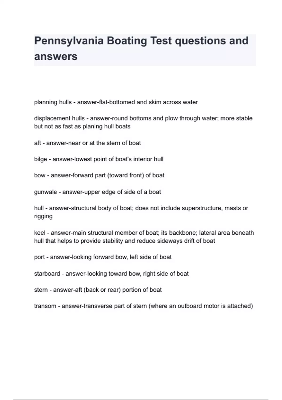 Pennsylvania Boating Test questions and answers planning hulls - answer-flat-bottomed and skim across water displacement hulls - answer-round bottoms and plow through water; more stable but not as fast as planing hull boats aft - answer-near or at the stern of boat bilge - answer-lowest point of boat's interior hull bow - answer-forward part (toward front) of boat gunwale - answer-upper edge of side of a boat hull - ans