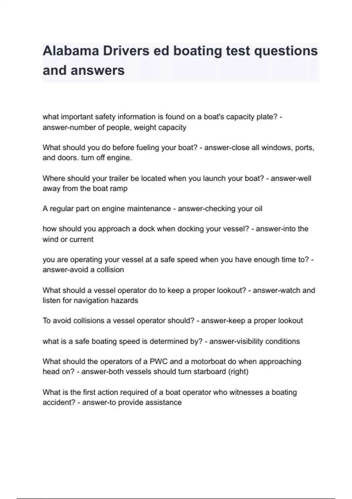 Alabama Drivers ed boating test questions and answers what important safety information is found on a boat's capacity plate? - answer-number of people, weight capacity What should you do before fueling your boat? - answer-close all windows, ports, and doors. turn off engine. Where should your trailer be located when you launch your boat? - answer-well away from the boat ramp A regular part on engine maintenance - answer-checking your oil how shoul