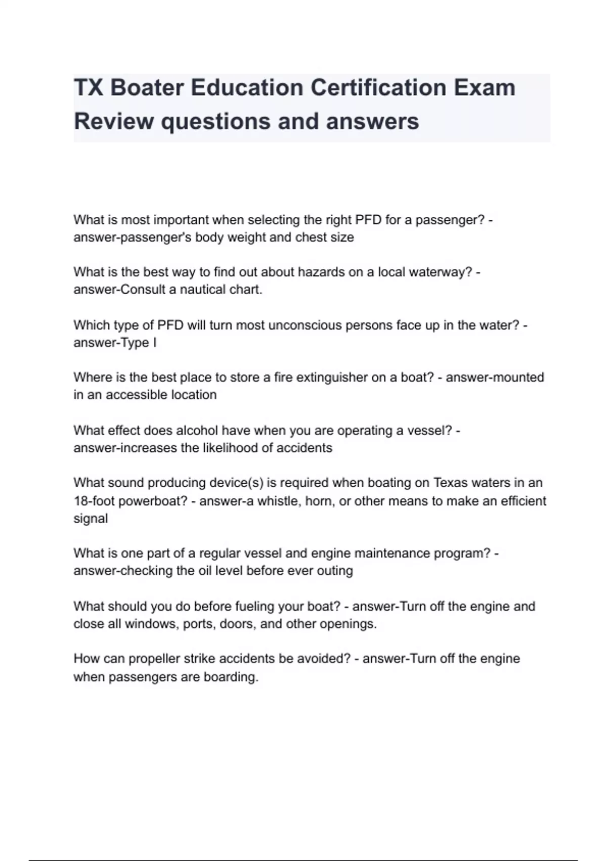 TX Boater Education Certification Exam Review questions and answers What is most important when selecting the right PFD for a passenger? - answer-passenger's body weight and chest size What is the best way to find out about hazards on a local waterway? - answer-Consult a nautical chart. Which type of PFD will turn most unconscious persons face up in the water? - answer-Type I Where is the best place to store a fire extinguisher on a boat? - answer-mounted in an accessible location What effect does alcohol have when you are operating a vessel? - answer-increases the likelihood of accidents What sound producing device(s) is required when boating on Texas waters in an 18-foot powerboat? - answer-a whistle, horn, or other means to make an efficient signal What is one part of