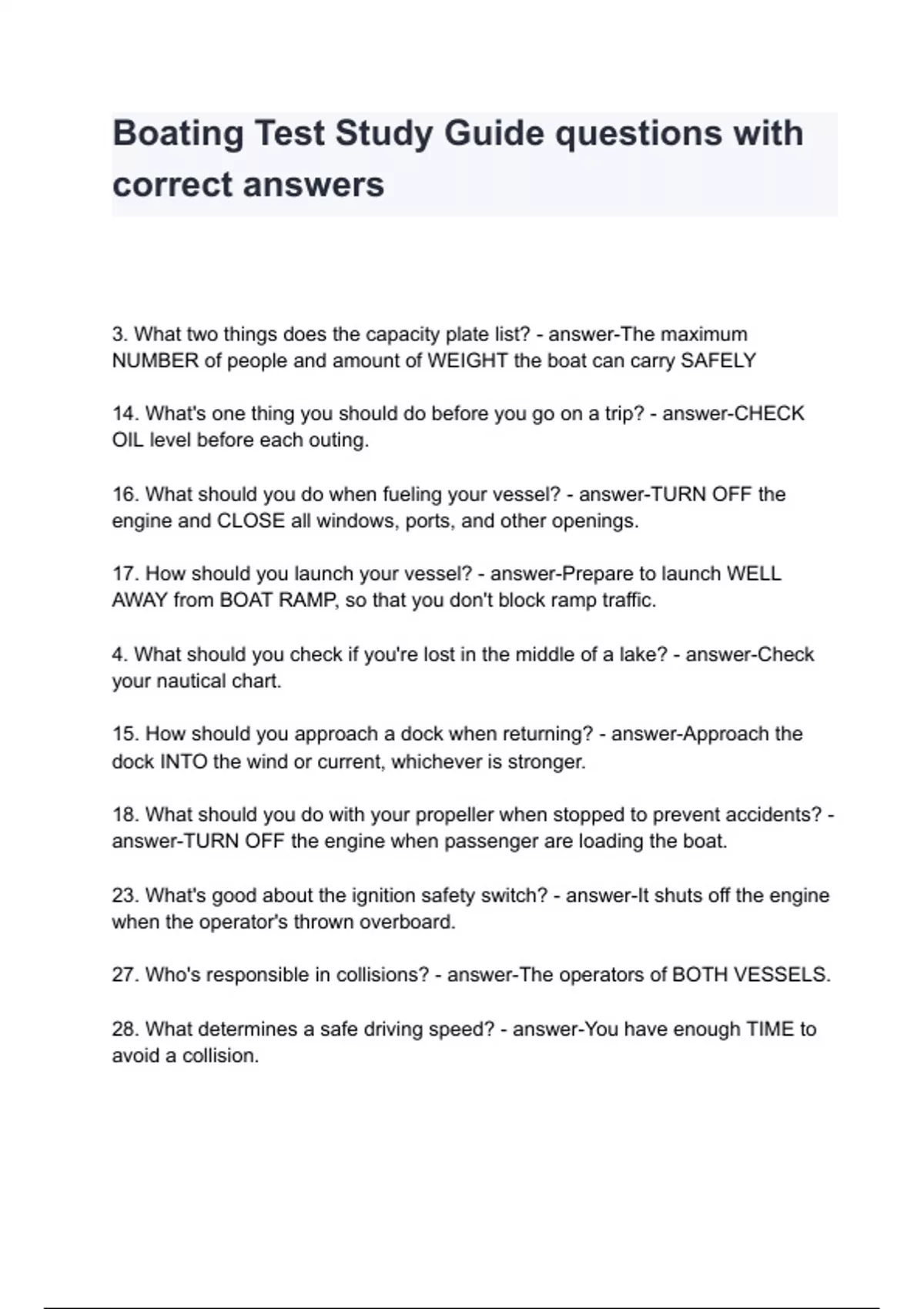 Boating Test Study Guide questions with correct answers 3. What two things does the capacity plate list? - answer-The maximum NUMBER of people and amount of WEIGHT the boat can carry SAFELY 14. What's one thing you should do before you go on a trip? - answer-CHECK OIL level before each outing. 16. What should you do when fueling your vessel? - answer-TURN OFF the engine and CLOSE all windows, ports, and other openings. 17. How should you launch your vessel? - answer-Prepare to launch WELL AWAY from BOAT RAMP, so that you don't block ramp traffic. 4. What should you check if you're lost in the middle of a lake? - answer-Check your nautical chart. 15. How should you approach a dock when returning? - answer-Approach the dock INTO the wind or current, whichever is stronger. 18. What should you do with your propeller when stopped to prevent accidents? - answe