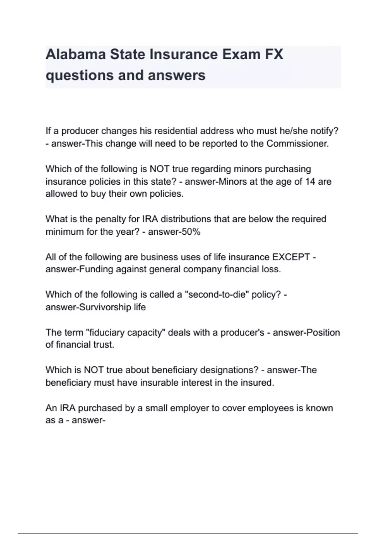 Alabama State Insurance Exam FX questions and answers
