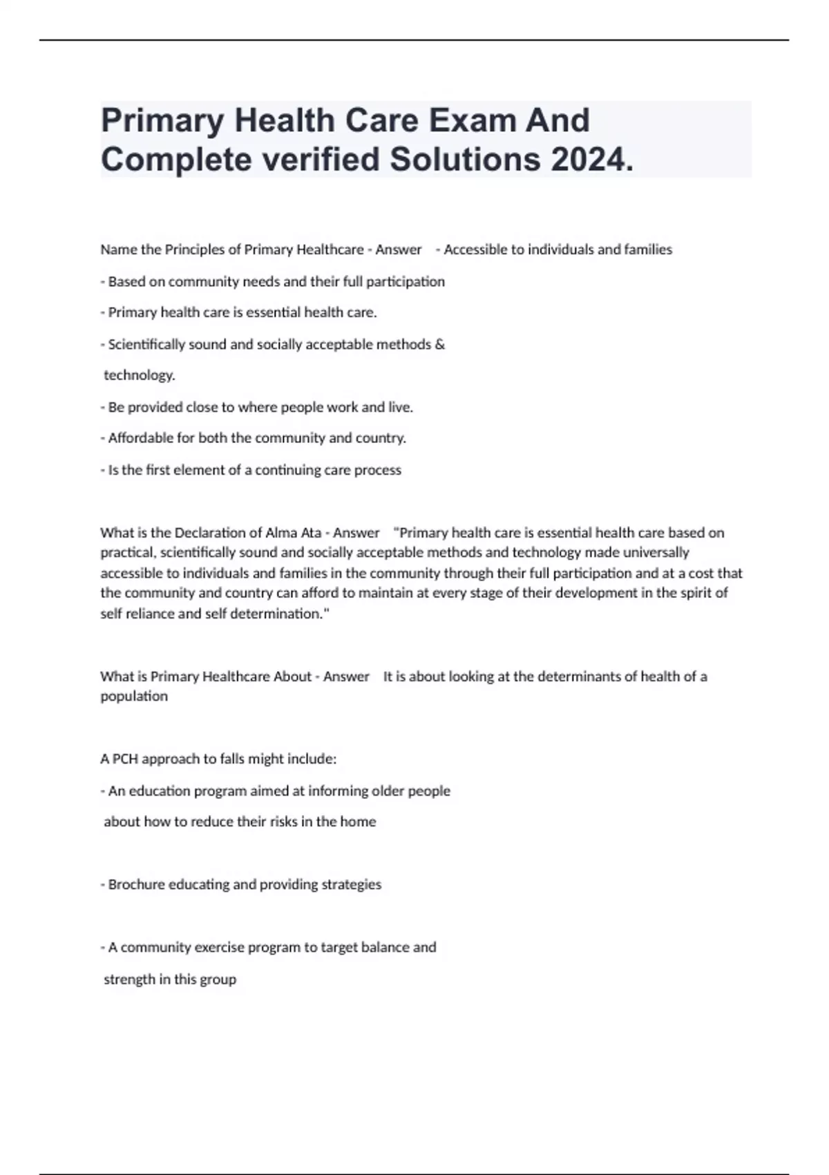 Name the Principles of Primary Healthcare - Answer - Accessible to individuals and families - Based on community needs and their full participation - Primary health care is essential health care. - Scientifically sound and socially acceptable methods & technology. - Be provided close to where people work and live. - Affordable for both the community and country. - Is the first element of a continuing care process What is the Declaration of Alma Ata - Answer "Primary health care is essential health care based on practical, scientifically sound and socially acceptable methods and technology made universally accessible to individuals and families in the community through their full participation and at a cost that the community and country can afford to maintain at every stage of their development in the spirit of self reliance and self determination." What is Primary Healthcare About - Answer It is about looking at the determinants of health of a population A PCH approach to falls might include: - An education program aimed at informing older people about how to reduce their risks in the home - Brochure educating and providing strategies - A community exercise program to target balance and strength in this group