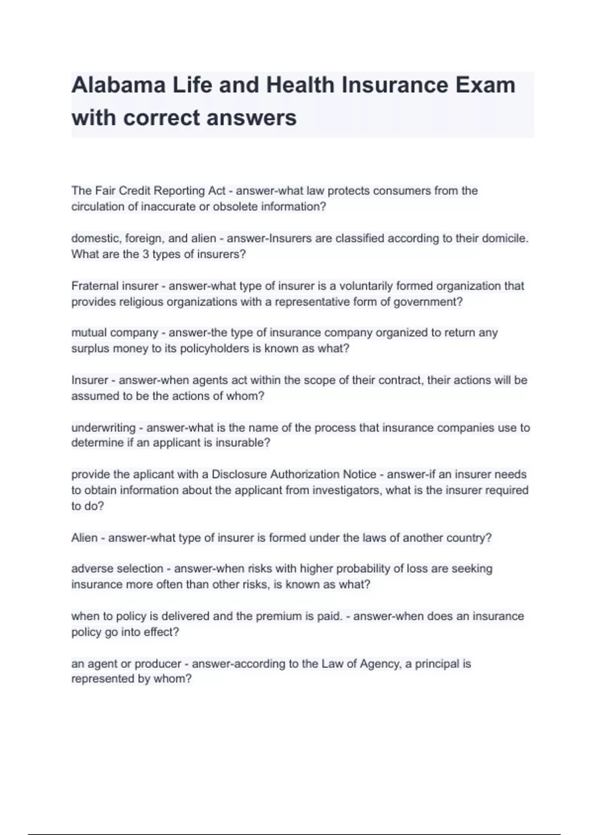 The Fair Credit Reporting Act - answer-what law protects consumers from the circulation of inaccurate or obsolete information? domestic, foreign, and alien - answer-Insurers are classified according to their domicile. What are the 3 types of insurers? Fraternal insurer - answer-what type of insurer is a voluntarily formed organization that provides religious organizations with a representative form of government? mutual company - answer-the type of insurance company organized to return any surplus money to its policyholders is known as what? Insurer - answer-when agents act within the scope of their contract, their actions will be assumed to be the actions of whom? underwriting - answer-what is the name of the process that insurance companies use to determine if an applicant is insurable? provide the aplicant with a Disclosure Authorization Notice - answer-if an insurer needs to obtain information about the applicant from investigators, what is the insurer required to do? Alien - answer-what type of insurer is formed under the laws of another country? adverse selection - answer-when risks with higher probability of loss are seeking insurance more ofte