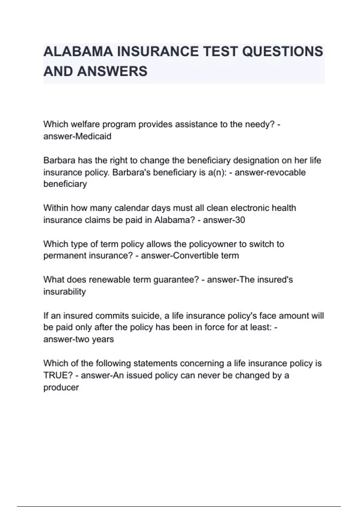 Which welfare program provides assistance to the needy? - answer-Medicaid Barbara has the right to change the beneficiary designation on her life insurance policy. Barbara's beneficiary is a(n): - answer-revocable beneficiary Within how many calendar days must all clean electronic health insurance claims be paid in Alabama? - answer-30 Which type of term policy allows the policyowner to switch to permanent insurance? - answer-Convertible term What does renewable term guarantee? - answer-The insured's insurability If an insured commits suicide, a life insurance policy's face amount will be pa