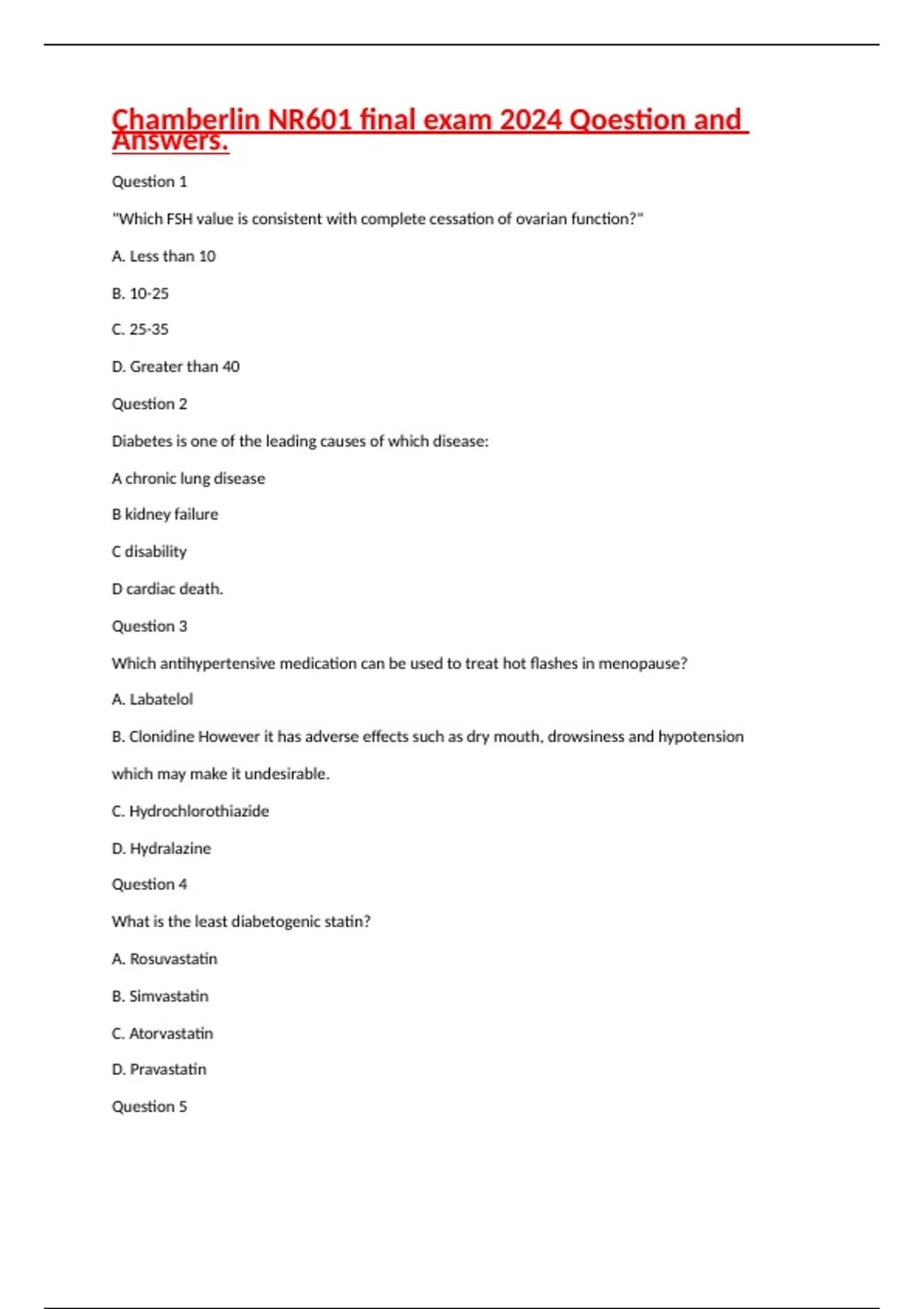 Question 1 "Which FSH value is consistent with complete cessation of ovarian function?" A. Less than 10 B. 10-25 C. 25-35 D. Greater than 40 Question 2 Diabetes is one of the leading causes of which disease: A chronic lung disease B kidney failure C disability D cardiac death. Question 3 Which antihypertensive medication can be used to treat hot flashes in menopause? A. Labatelol B. Clonidine However it has adverse effects such as dry mouth, drowsiness and hypotension which may make it undesirable. C. Hydrochlorothiazide D. Hydralazine Question 4 What is the least diabetogenic statin? A. Rosuvastatin B. Simvastatin C. Atorvastatin D. Pravastatin Question 5 Bence Jones proteins found in a urinalysis may be indicative of: A. Leukemia B. Lymphosarcoma C. Multiple myeloma D. All of the above Question 6 What is the first line medication for new type 2 diabetic? A.Novolog B. Penicillin C. Metformin D. Glyburide Question 7 Protein on a urinalysis usually has a renal pathology, specific to which renal structure? A. Glomerulous B. Renal cortex C. Medulla D. Nephron Question 8 What is the hA1C goal for diabetic patients with complex health status (multiple chronic conditions)? A. <7.5 B. <8.0 Its B. VERY complex is 8.5. I feel like that's tricky C. <8.5