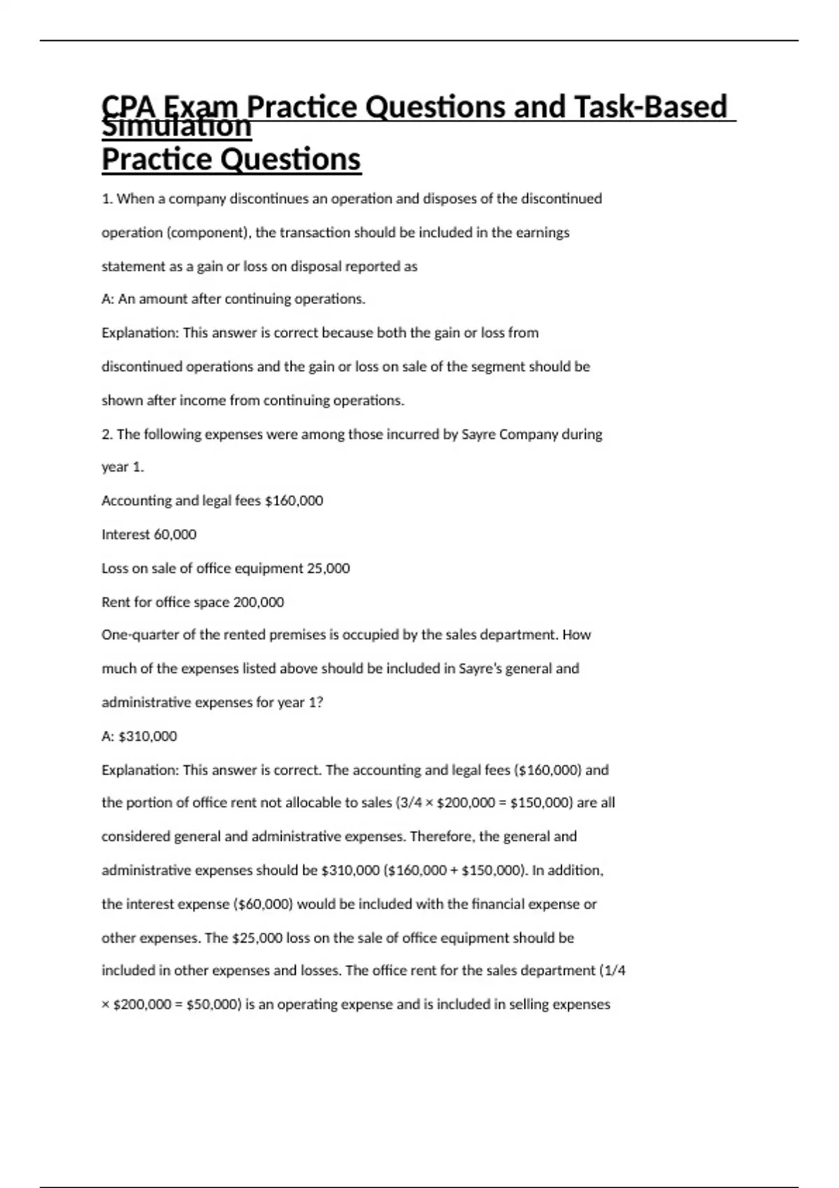 1. When a company discontinues an operation and disposes of the discontinued operation (component), the transaction should be included in the earnings statement as a gain or loss on disposal reported as A: An amount after continuing operations. Explanation: This answer is correct because both the gain or loss from discontinued operations and the gain or loss on sale of the segment should be shown after income from continuing operations. 2. The following expenses were among those incurred by Sayre Company during year 1. Accounting and legal fees $160,000 Interest 60,000 Loss on sale of office equipment 25,000 Rent for office space 200,000 One-quarter of the rented premises is occupied by the sales department. How much of the expenses listed above should be included in Sayre’s general and administrative expenses for year 1? A: $310,000 Explanation: This answer is correct. The accounting and legal fees ($160,000) and the portion of office rent not allocable to sales (3/4 × $200,000 = $150,000) are all considered general and administrative expenses. Therefore, the general and administrative expenses should be $310,000 ($160,000 + $150,000). In addition, the interest expense ($60,000) would be included with the financial expense or other expenses. The $25,000 loss on the sale of office equipment should be included in other expenses and losses. The office rent for the sales department (1/4 × $200,000 = $50,000) is an operating expense and is included in selling expenses rather than general and administrative expenses. 3. The correction of an error in the financial statements of a prior period should be reflected, net of applicable income taxes, in the current A: Retained earnings statement as an adjustment of the opening balance. Explanation: This answer is correct because the correction of an error in the financial statements of a prior period is a prior period adjustment which is to be shown net of tax as an adjustment to the beginning balance of retained
