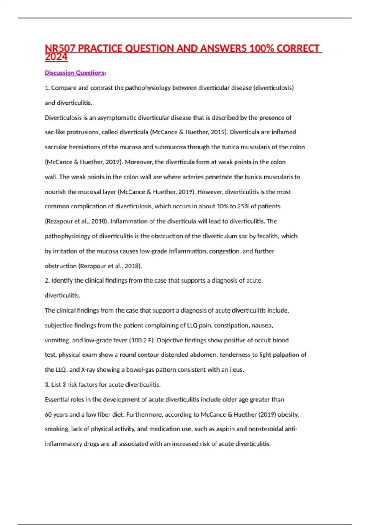 1. Compare and contrast the pathophysiology between diverticular disease (diverticulosis) and diverticulitis. Diverticulosis is an asymptomatic diverticular disease that is described by the presence of sac-like protrusions, called diverticula (McCance & Huether, 2019). Diverticula are inflamed saccular herniations of the mucosa and submucosa through the tunica muscularis of the colon (McCance & Huether, 2019). Moreover, the diverticula form at weak points in the colon wall. The weak points in the colon wall are where arteries penetrate the tunica muscularis to nourish the mucosal layer (McCance & Huether, 2019). However, diverticulitis is the most common complication of diverticulosis, which occurs in about 10% to 25% of patients (Rezapour et al., 2018). Inflammation of the diverticula will lead to diverticulitis. The pathophysiology of diverticulitis is the obstruction of the diverticulum sac by fecalith, which by irritation of the mucosa causes low-grade inflammation, congestion, and further obstruction (Rezapour et al., 2018). 2. Identify the clinical findings from the case that supports a diagnosis of acute diverticulitis. The clinical findings from the case that support a diagnosis of acute diverticulitis include, subjective findings from the patient complaining of LLQ pain, constipation, nausea, vomiting, and low-grade fever (100.2 F). Objective findings show positive of occult blood test, physical exam show a round contour distended abdomen, tenderness to light