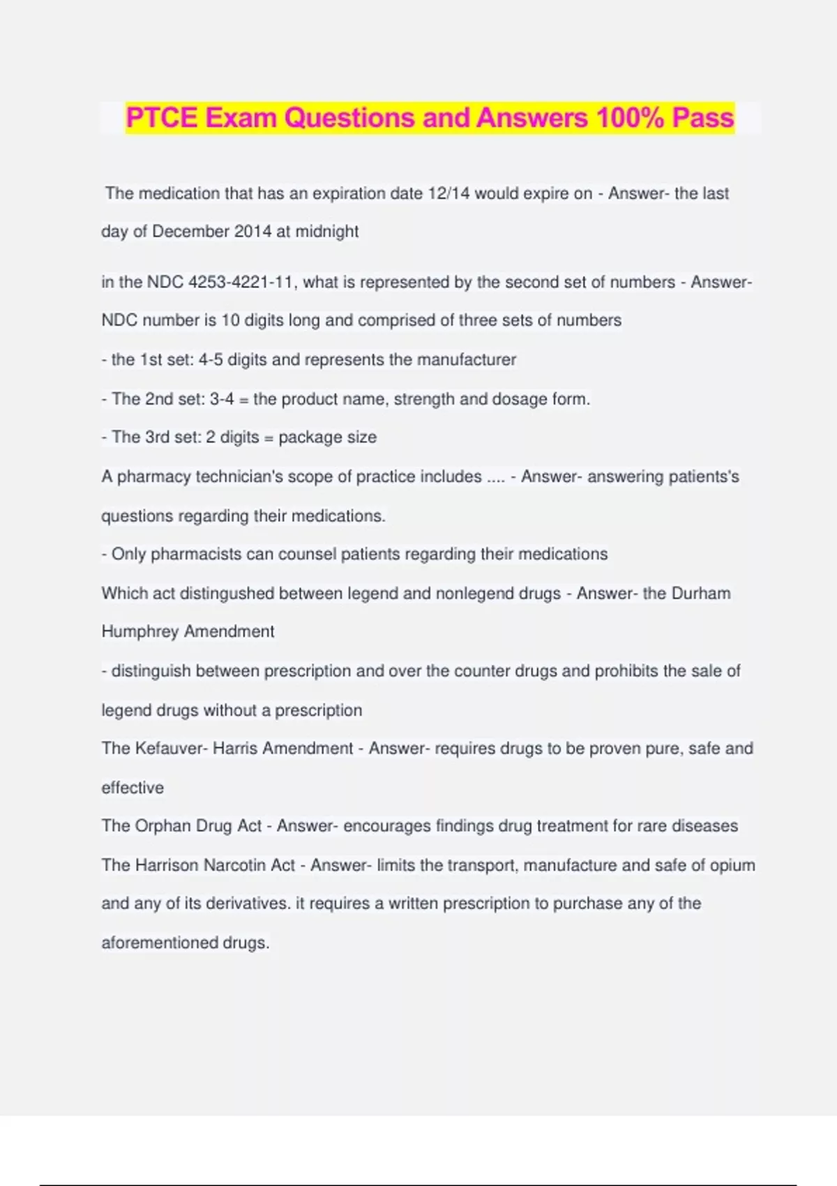PTCE Exam Questions and Answers 100% Pass The medication that has an expiration date 12/14 would expire on - Answer- the last day of December 2014 at midnight in the NDC , what is represented by the second set of numbers - Answer- NDC number is 10 digits long and comprised of three sets of numbers - the 1st set: 4-5 digits and represents the manufacturer - The 2nd set: 3-4 = the product name, strength and dosage form. - The 3rd set: 2 digits = package size A pharmacy technician's scope of practice includes .... - Answer- answering patients's questions regarding their medications. - Only pharmacists can counsel patients regarding their medications Which act distingushed between legend and nonlegend drugs - Answer- the Durham Humphrey Amendment - distinguish between prescription and over the counter drugs and prohibits the sale of legend drugs without a prescription The Kefauver- Harris Amendment - Answer- requires drugs to be proven pure, safe and effective The Orphan Drug Act - Answer- encourages findings drug treatment for rare diseases The Harrison Narcotin Act - Answer- limits the transport, manufacture and safe of opium and any of its derivatives. it requires a written prescription to purchase any of the aforementioned drugs. What is the maximum number of refills permitted for a schedule III-V medication - Answer- Five refills within 6 months, whichever occurs first. therefor a new prescription is required A pharmacy technician receives a prescription that reads 2 gtt AU BID. What will the label placed on the patient's medication read? - Answer- Two drops in both ears two times daily - 2gtt : 2 drops - AU : both ears - BID: Twice a day What is CCXLIX equivalent to - Answer- 249 Reducing a substance to fine particles using a mortar and pestle is know as - Answer- Triturating - breaking down of compounds into their finer particles Automated dispensing machines - Answer- Accu-DOse, Omicell, Pyxis and ScriptPro Digital pill counting machines - Answer- Baker Cell and Kirby Lester How may days will the following prescription last ? - Famotidine: 20mg # 120 - SIg: Famitidine 40mg po BID - Answer- - 30 days = 120 total # of tablets/ 4 # of tablets taken per day - Famotidine 40 mp BID = 4 tablets/ day How old must a person be to purchase an exempt narcotic or Schedule? - Answer- 18 years old - The quantity of purchase, the date of purchase ad the residential address of the purchaser ( not PO Box) must be record T/F : a laminar flow hood is cleaned by using bleach and wate - Answer- False - Need to be clean with water followed by 70% isopropyl alcohol T/F : A horizontal laminar flow hood can be used for compounding chemotherapy - Answer- Hazardous products such as chemotherapy can only be compounded under a vertical flow hood or a barrier isolator with negative pressure T/F: compound sterile products are also known as extemporaneous compounding. - Answer- False - Extemporanous compounding are non - commercially available and non sterile products that are prepared for specific patients in response to a physician's percription. T/F: A barrier isolator or a horizontal laminar flow hood can be used to compound IV antibiotics - Answer- True To measure liquids in a graduated cylinder - Answer- one must read at eye level the lower portion of the meniscus.