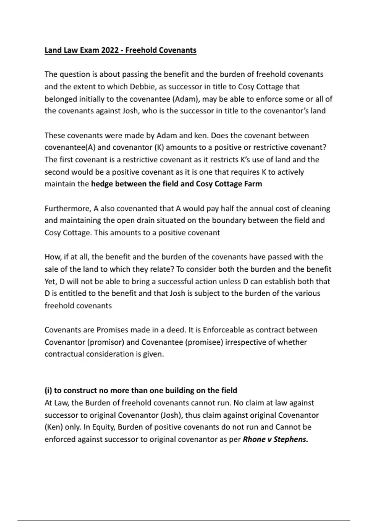 Land Law Exam 2022 - Freehold Covenants