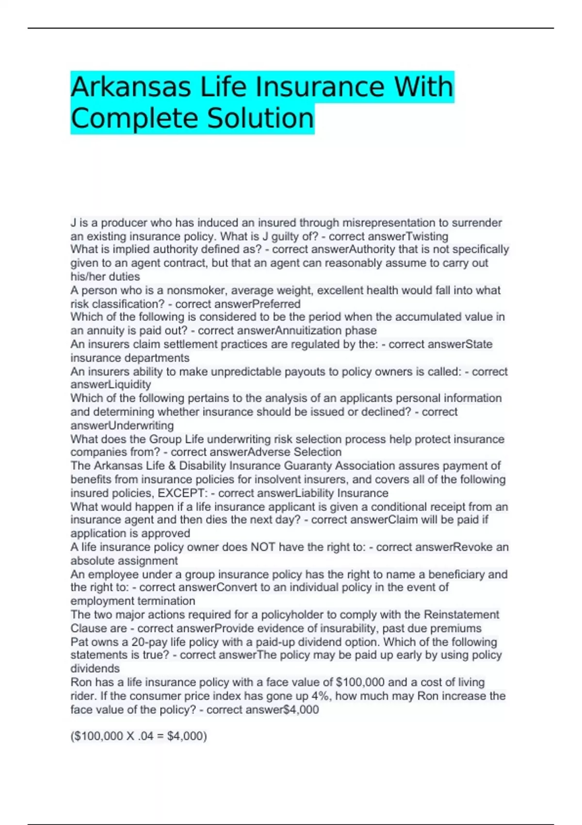Arkansas Life Insurance With Complete Solution J is a producer who has induced an insured through misrepresentation to surrender an existing insurance policy. What is J guilty of? - correct answerTwisting What is implied authority defined as? - correct answerAuthority that is not specifically given to an agent contract, but that an agent can reasonably assume to carry out his/her duties A person who is a nonsmoker, average weight, excellent health would fall into what risk classification? - correct answerPreferred Which of the following is considered to be the period when the accumulated value in an annuity is paid out? - correct answerAnnuitization phase An insurers claim settlement practices are regulated by the: - correct answerState insurance departments An insurers ability to make unpredictable payouts to policy owners is called: - correct answerLiquidity Which of the following pertains to the analysis of an applicants personal information and determining whether insurance should be issued or declined? - correct answerUnderwriting What does the Group Life underwriting risk selection process help protect insurance companies from? - correct answerAdverse Selection The Arkansas Life & Disability Insurance Guaranty Association assures payment of benefits from insurance policies for insolvent insurers, and covers all of the following insured policies, EXCEPT: - correct answerLiability Insurance What would happen if a life insurance applicant is given a conditional receipt from an insurance agent and then dies the next day? - correct answerClaim will be paid if application is approved A life insurance policy owner does NOT have the right to: - correct answerRevoke an absolute assignment An employee under a group insurance policy has the right to name a beneficiary and the right to: - correct answerConvert to an individual policy in the event of employment termination The two major actions required for a policyholder to comply with the Reinstatement Clause are - correct answerProvide evidence of insurability, past due premiums Pat owns a 20-pay life policy with a paid-up dividend option. Which of the following statements is true? - correct answerThe policy may be paid up early by using policy dividends Ron has a life insurance policy with a face value of $100,000 and a cost of living rider. If the consumer price index has gone up 4%, how much may Ron increase the face value of the policy? - correct answer$4,000 ($100,000 X .04 = $4,000) Krissa purchases a 10-year level term life insurance policy that has a death benefit of $200,000. Which of these statements is true? - correct answerThe face amount and premium will remain constant over the 10-year period What is Arkansas' REQUIRED grace period for a life insurance contract? - correct answer31 days A domestic insurance company in Arkansas MUST - correct answerBe organized under Arkansas Insurance laws Simon has purchased a fixed immediate annuity. His payment amount will be dependent upon principal, interest, and the contract's - correct answerIncome period What kind of life insurance policy issued by a mutual insurer provides a return of divisible surplus? - correct answerParticipating life insurance policy No one is allowed to act as a producer for any insurance company in Arkansas that - correct answerIs unauthorized to do business in Arkansas What MUST the company do prior to conducting an HIV related test? - correct answerObtain a written consent from the proposed insured Which approach predicts a person's earning potential and determines how much of that amount would be devoted to dependents? - correct answerHuman life value approach If the annuitant dies before the annuity start date, - correct answerThe premiums paid plus interest earned will be given to the beneficiary If dividends are illustrated, the advertisement MUST state that the dividends are: - correct answerNot guaranteed Intentional withholding of material facts that would affect an insurance policy's validity is called a(n) - correct answerConcealment Field underwriting performed by the producer involves - correct answerCompleting the application and collecting initial premium Which of the following statements is CORRECT regarding an individual applying for life or health insurance? - correct answerThe applicants medical history may be analyzed and reported Life insurance policies will normally pay for losses arising from - correct answerCommercial aviation An example of rebating would be - correct answerOffering a client something of value not stated in the contract in exchange for their business Which type of insurance company allows their policyowners to elect governing body? - correct answerMutual Which type of life insurance policy pays the face amount at the end of the specified period if the insured is still alive? - correct answerEndowment policy A life insurance claim which involves a per capita distribution of policy proceeds would be payable to the - correct answerNamed living primary beneficiaries A type of group that has a constitution and bylaws and has been organized for purposes other than obtaining insurance is called a(n) - correct answerAssociation or labor group What are an applicant's statements concerning occupation, hobbies, and personal health history regarded as? - correct answerRepresentation Ken is a producer who has obtained Consumer Information Reports under false pretenses. Under the Fair Credit Reporting Act, what is the maximum penalty that may be imposed on Ken? - correct answer$5,000 The _________ must provide an insured with proper disclosure concerning the replacement of a life insurance policy - correct answerProducer Within how many days must a rollover be completed in order to avoid being taxed as current income? - correct answer60 days to complete the rollover to another IRA Shawn, Mike, and Dave are brothers who have a $100,000 "first to die" joint life policy covering all three of their lives. If Mike dies first, the policy proce